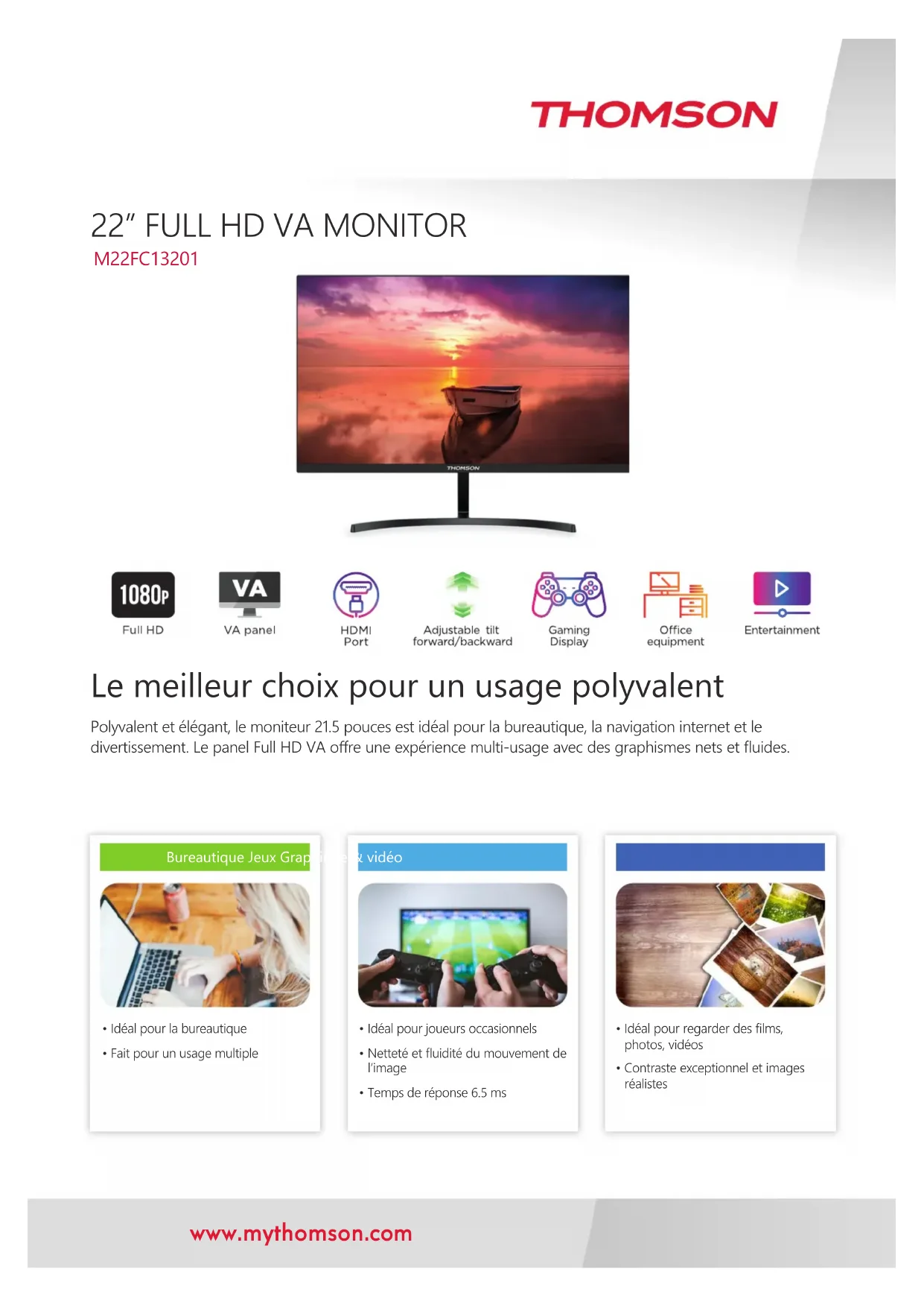 www.mythomson.com Le meilleur choix pour un usage polyvalent Polyvalent et élégant, le moniteur 21.5 pouces est idéal pour la bureautique, la navigation internet et le divertissement. Le panel Full HD VA ore une expérience multi-usage avec des graphismes nets et uides.