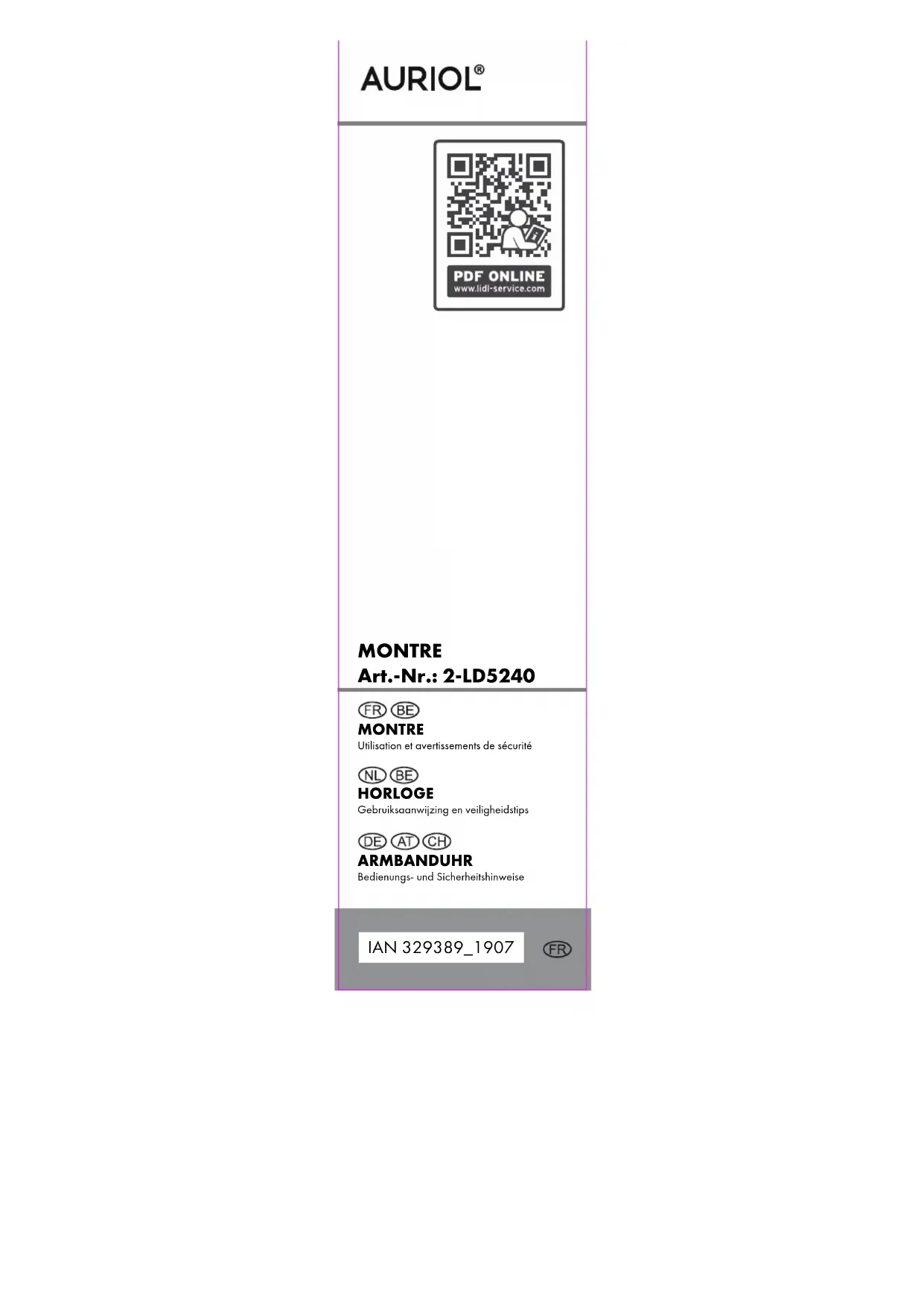 Avec ce code QR, vous pouvez accéder directement à la page de service Lidl (www.lidl- service.com) et ouvrir votre notice d´utilisation en saisissant le numéro d´article (329389_1907). Service Après Vente Nom: Inter-Quartz GmbH Rue: Valterweg 27A Ville: DE-65817 Eppstein Pays: ALLEMAGNE Courriel/Mail: support@inter-quartz.de Téléphone: +49 (0)6198 571825
