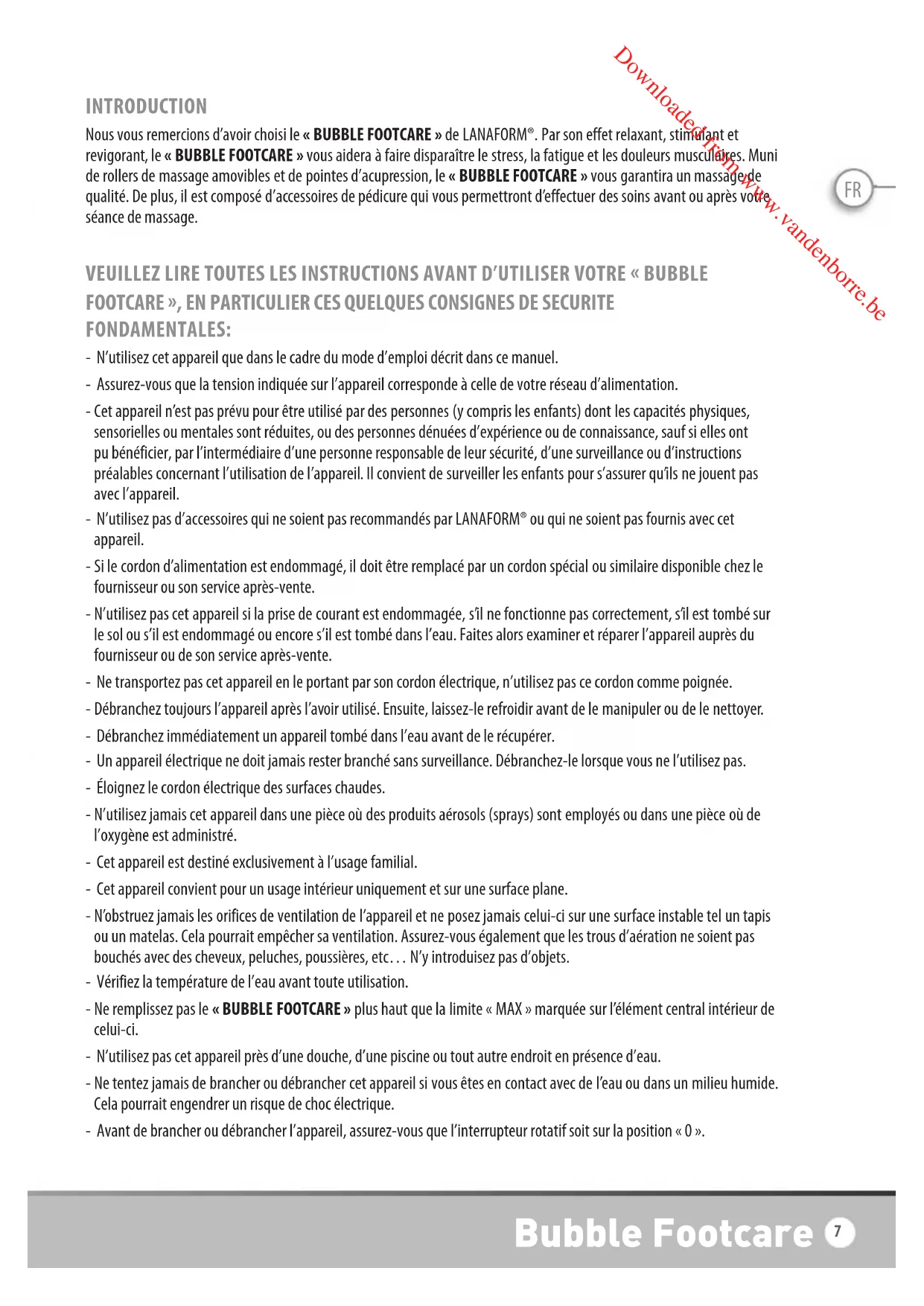 Downloaded from www.vandenborre.beFR INTRODUCTION Nous vous remercions d’avoir choisi le « BUBBLE FOOTCARE » de LANAFORM®. Par son effet relaxant, stimulant et revigorant, le « BUBBLE FOOTCARE » vous aidera à faire disparaître le stress, la fatigue et les douleurs musculaires. Muni de rollers de massage amovibles et de pointes d’acupression, le « BUBBLE FOOTCARE » vous garantira un massage de qualité. De plus, il est composé d’accessoires de pédicure qui vous permettront d’effectuer des soins avant ou après votre séance de massage. VEUILLEZ LIRE TOUTES LES INSTRUCTIONS AVANT D’UTILISER VOTRE BUBBLE FOOTCARE , EN PARTICULIER CES QUELQUES CONSIGNES DE SECURITE FONDAMENTALES: - N’utilisez cet appareil que dans le cadre du mode d’emploi décrit dans ce manuel. - Assurez-vous que la tension indiquée sur l’appareil corresponde à celle de votre réseau d’alimentation. - Cet appareil n’est pas prévu pour être utilisé par des personnes (y compris les enfants) dont les capacités physiques, sensorielles ou mentales sont réduites, ou des personnes dénuées d’expérience ou de connaissance, sauf si elles ont pu bénéficier, par l’intermédiaire d’une personne responsable de leur sécurité, d’une surveillance ou d’instructions préalables concernant l’utilisation de l’appareil. Il convient de surveiller les enfants pour s’assurer qu’ils ne jouent pas avec l’appareil. - N’utilisez pas d’accessoires qui ne soient pas recommandés par LANAFORM® ou qui ne soient pas fournis avec cet appareil. - Si le cordon d’alimentation est endommagé, il doit être remplacé par un cordon spécial ou similaire disponible chez le fournisseur ou son service après-vente. - N’utilisez pas cet appareil si la prise de courant est endommagée, s’il ne fonctionne pas correctement, s’il est tombé sur le sol ou s’il est endommagé ou encore s’il est tombé dans l’eau. Faites alors examiner et réparer l’appareil auprès du fournisseur ou de son service après-vente. - Ne transportez pas cet appareil en le portant par son cordon électrique, n’utilisez pas ce cordon comme poignée. - Débranchez toujours l’appareil après l’avoir utilisé. Ensuite, laissez-le refroidir avant de le manipuler ou de le nettoyer. - Débranchez immédiatement un appareil tombé dans l’eau avant de le récupérer. - Un appareil électrique ne doit jamais rester branché sans surveillance. Débranchez-le lorsque vous ne l’utilisez pas. - Éloignez le cordon électrique des surfaces chaudes. - N’utilisez jamais cet appareil dans une pièce où des produits aérosols (sprays) sont employés ou dans une pièce où de l’oxygène est administré. - Cet appareil est destiné exclusivement à l’usage familial. - Cet appareil convient pour un usage intérieur uniquement et sur une surface plane. - N’obstruez jamais les orifices de ventilation de l’appareil et ne posez jamais celui-ci sur une surface instable tel un tapis ou un matelas. Cela pourrait empêcher sa ventilation. Assurez-vous également que les trous d’aération ne soient pas bouchés avec des cheveux, peluches, poussières, etc… N’y introduisez pas d’objets. - Vérifiez la température de l’eau avant toute utilisation. - Ne remplissez pas le « BUBBLE FOOTCARE » plus haut que la limite « MAX » marquée sur l’élément central intérieur de celui-ci. - N’utilisez pas cet appareil près d’une douche, d’une piscine ou tout autre endroit en présence d’eau. - Ne tentez jamais de brancher ou débrancher cet appareil si vous êtes en contact avec de l’eau ou dans un milieu humide. Cela pourrait engendrer un risque de choc électrique. - Avant de brancher ou débrancher l’appareil, assurez-vous que l’interrupteur rotatif soit sur la position « 0 ». Bubble Footcare