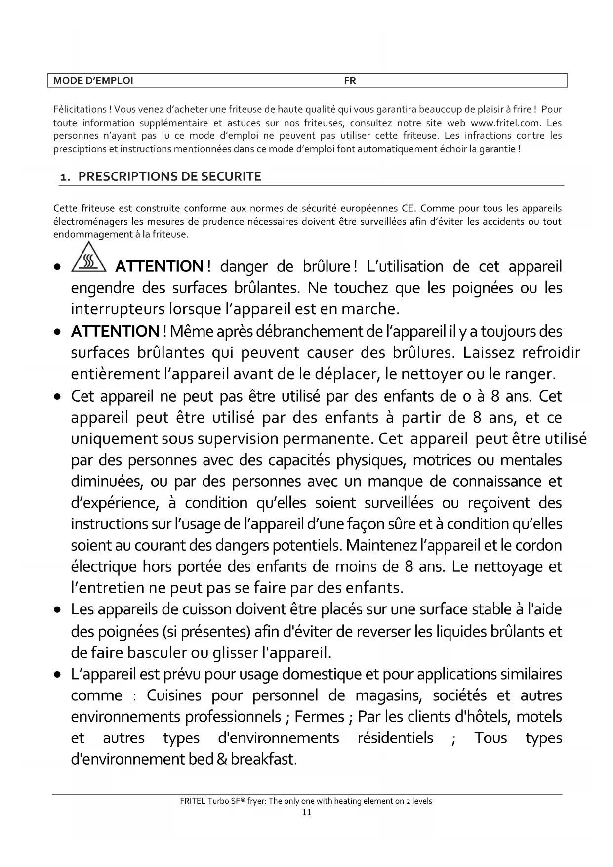 - La garantie ne peut être invoquée en cas d’usure normale.FRITEL Turbo SF® fryer: The only one with heating element on 2 levels