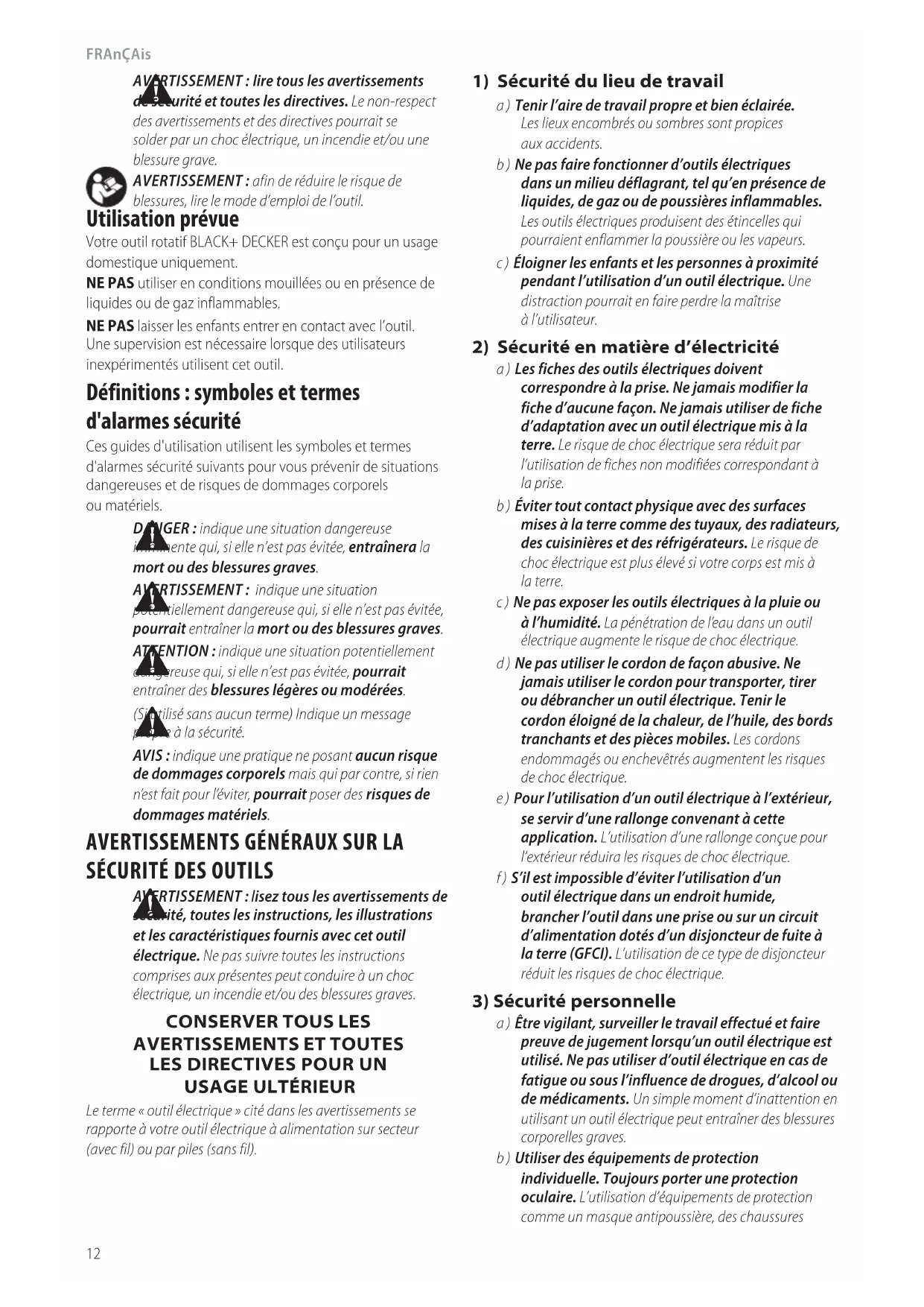 (Si utilisé sans aucun terme) Indique un message propre à lasécurité. AVIS : indique une pratique ne posant aucun risque de dommages corporels mais qui par contre, si rien n’est fait pour l’éviter, pourrait poser des risques de dommagesmatériels. Utilisation prévue Votre outil rotatif BLACK+ DECKER est conçu pour un usage domestique uniquement. NE PAS utiliser en conditions mouillées ou en présence de liquides ou de gaz inflammables. NE PAS laisser les enfants entrer en contact avec l’outil. Une supervision est nécessaire lorsque des utilisateurs inexpérimentés utilisent cet outil. Français (traduction de la notice d’instructions originale)