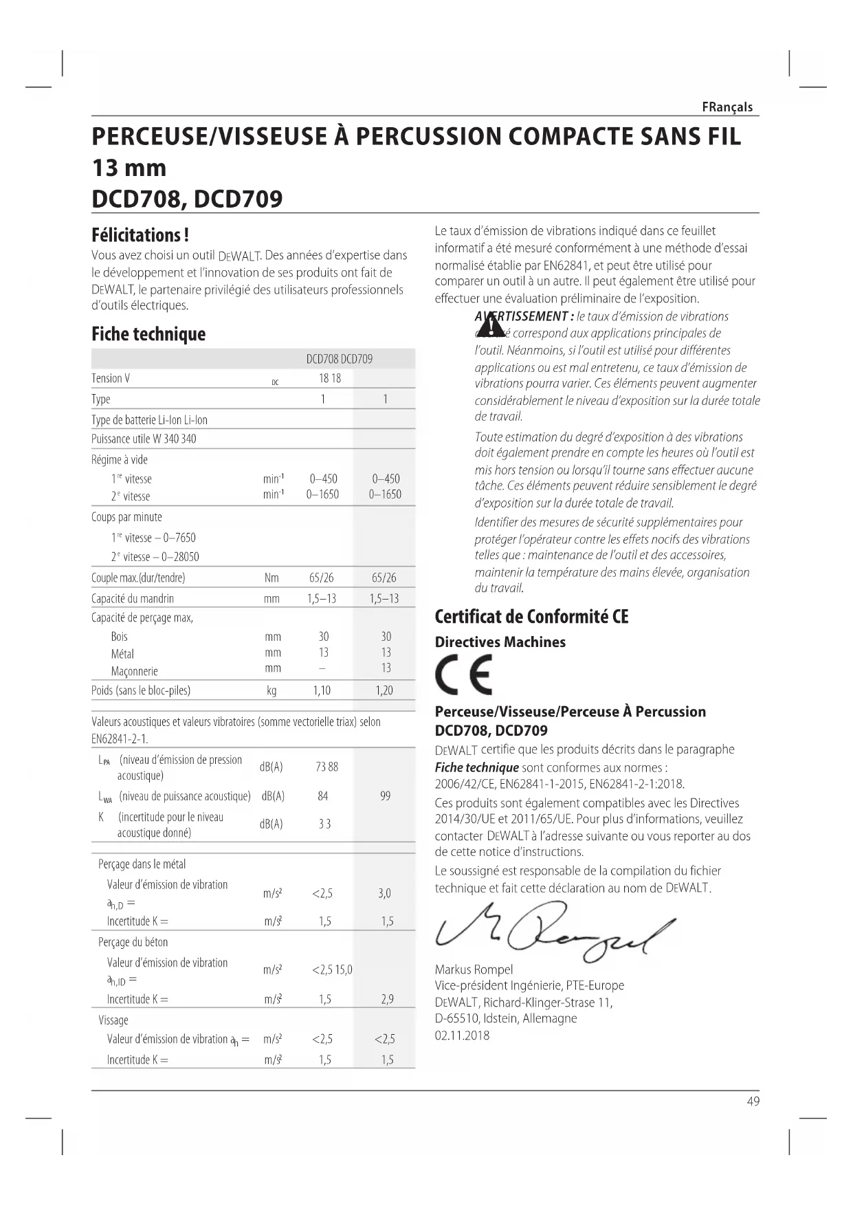 déclaré correspond aux applications principales de l’outil. Néanmoins, si l’outil est utilisé pour différentes applications ou est mal entretenu, ce taux d’émission de vibrations pourra varier. Ces éléments peuvent augmenter considérablement le niveau d’exposition sur la durée totale detravail. Toute estimation du degré d’exposition à des vibrations doit également prendre en compte les heures où l’outil est mis hors tension ou lorsqu’il tourne sans effectuer aucune tâche. Ces éléments peuvent réduire sensiblement le degré d’exposition sur la durée totale detravail. Identifier des mesures de sécurité supplémentaires pour protéger l’opérateur contre les effets nocifs des vibrations telles que: maintenance de l’outil et des accessoires, maintenir la température des mains élevée, organisation dutravail. Certificat de Conformité CE Directives Machines Perceuse/Visseuse/Perceuse À Percussion DCD708, DCD709 DeWALT certifie que les produits décrits dans le paragraphe Fiche technique sont conformes aux normes: 2006/42/CE, EN62841-1-2015, EN62841-2-1:2018. Ces produits sont également compatibles avec les Directives 2014/30/UE et 2011/65/UE. Pour plus d’informations, veuillez contacter DeWALT à l’adresse suivante ou vous reporter au dos de cette notice d’instructions. Le soussigné est responsable de la compilation du fichier technique et fait cette déclaration au nom de DeWALT