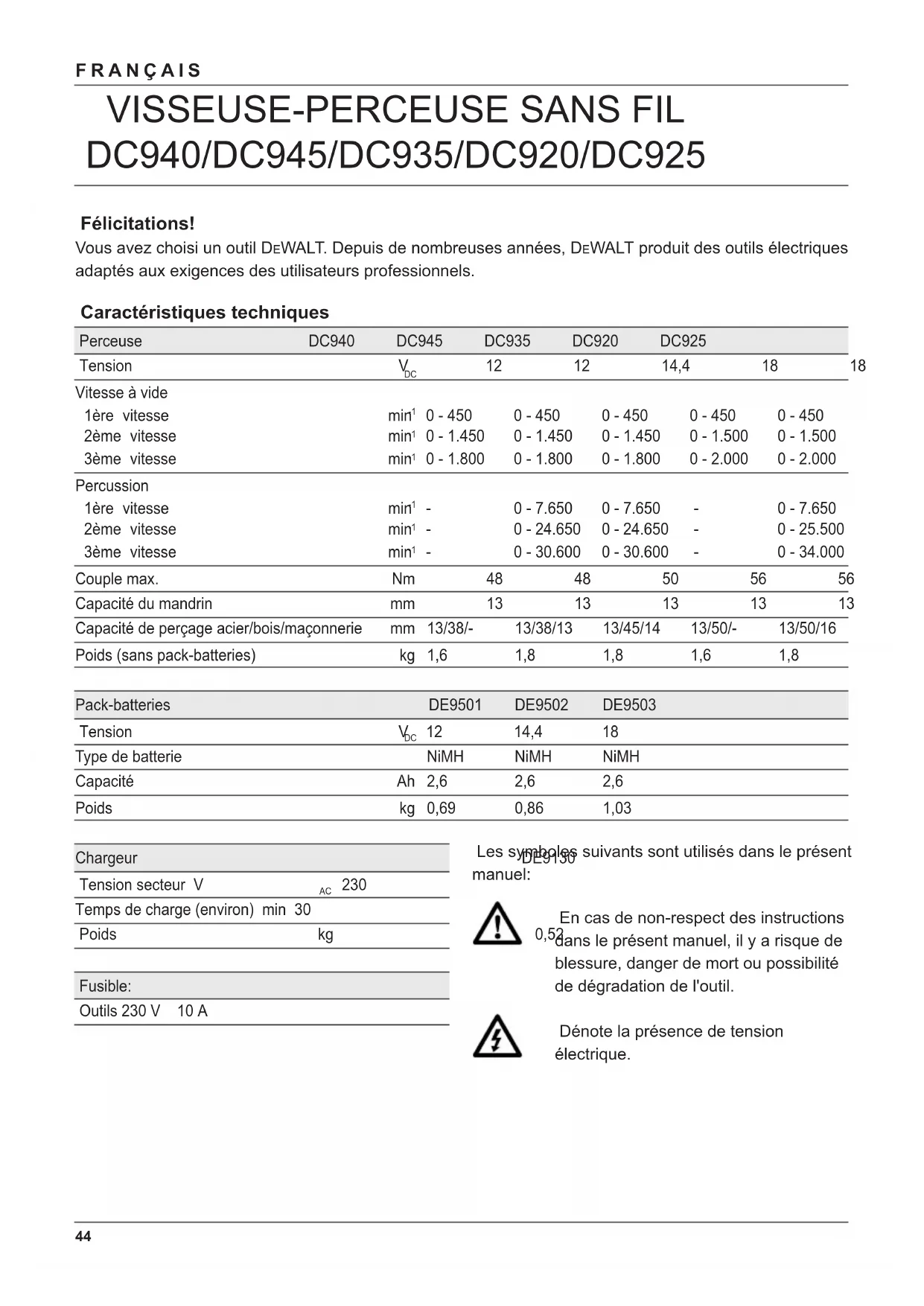 Félicitations! Vous avez choisi un outil D E WALT. Depuis de nombreuses années, D E WALT produit des outils électriques adaptés aux exigences des utilisateurs professionnels. Caractéristiques techniques Perceuse DC940 DC945 DC935 DC920 DC925 Tension V 12 12 14,4 18 18 Vitesse à vide 1ère vitesse min
