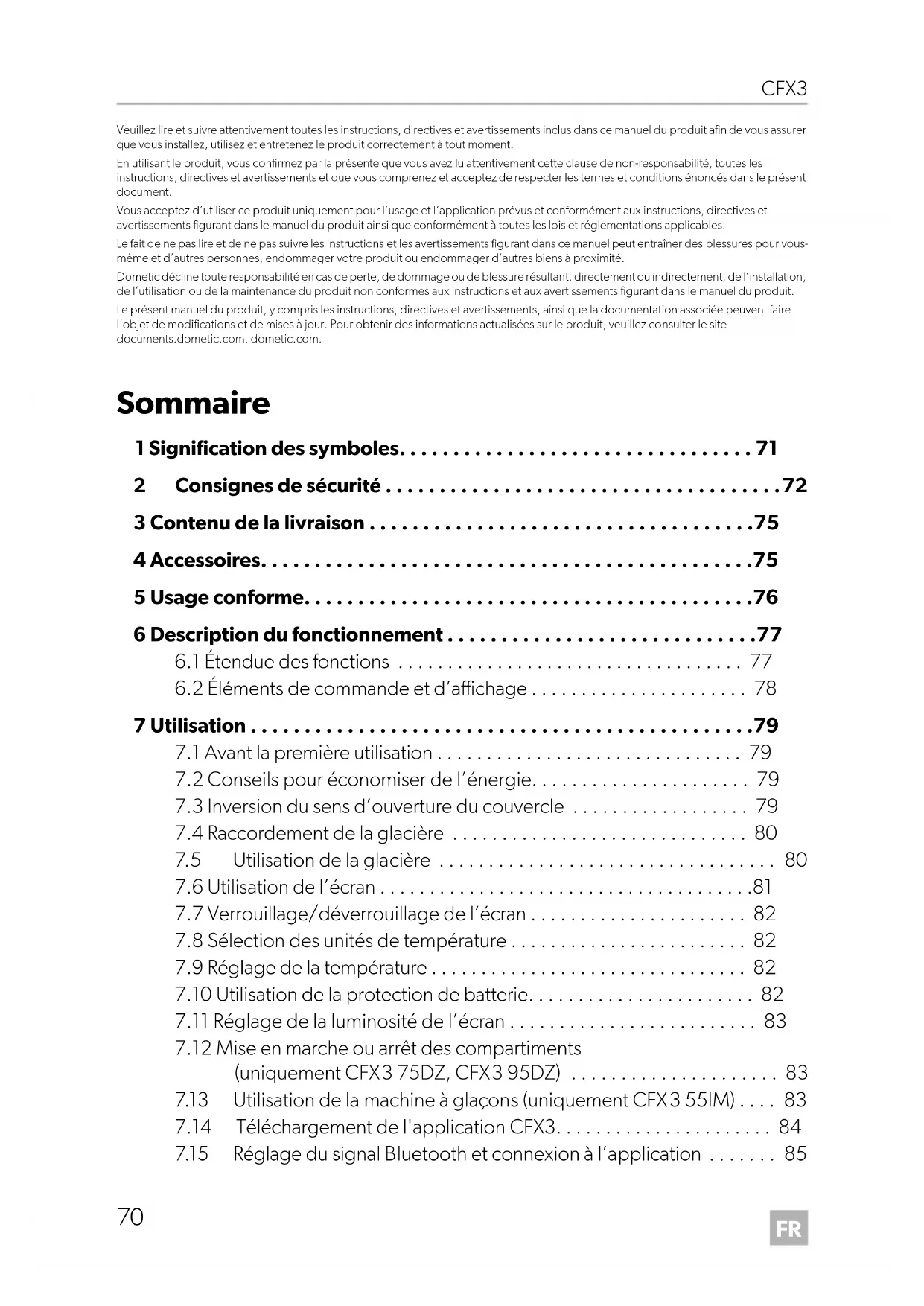 - Ne stockez aucune substance explosive comme p. ex. des aérosols contenant des agents propulseurs dans l'appareil. REMARQUE Informations complémentaires sur l'utilisation du produit. DometicCFX3_OPM_4445103157_EMEA16_202x-xx-xx.book Seite 72 Dienstag, 27. Oktober 2020 5:42 17FR CFX3 Consignes de sécurité