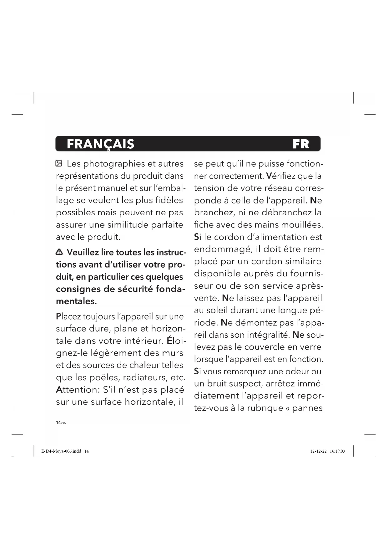 - Dimensions: 13 × 14 × 14 cm E-IM-Moya-006.indd 21E-IM-Moya-006.indd 21 12-12-22 16:19:0312-12-22 16:19:0322 / 96 Conseils relatifs à l’élimination des déchets L’emballage est entièrement composé de ma- tériaux sans danger pour L’environnement qui peuvent être déposés auprès du centre de tri de votre commune pour être utilisés comme matières secondaires. Le carton peut être placé dans un bac de collecte papier. Les lms d’em- ballage doivent être remis au centre de tri et de recyclage de votre commune. Lorsque vous ne vous servez plus de L’appa