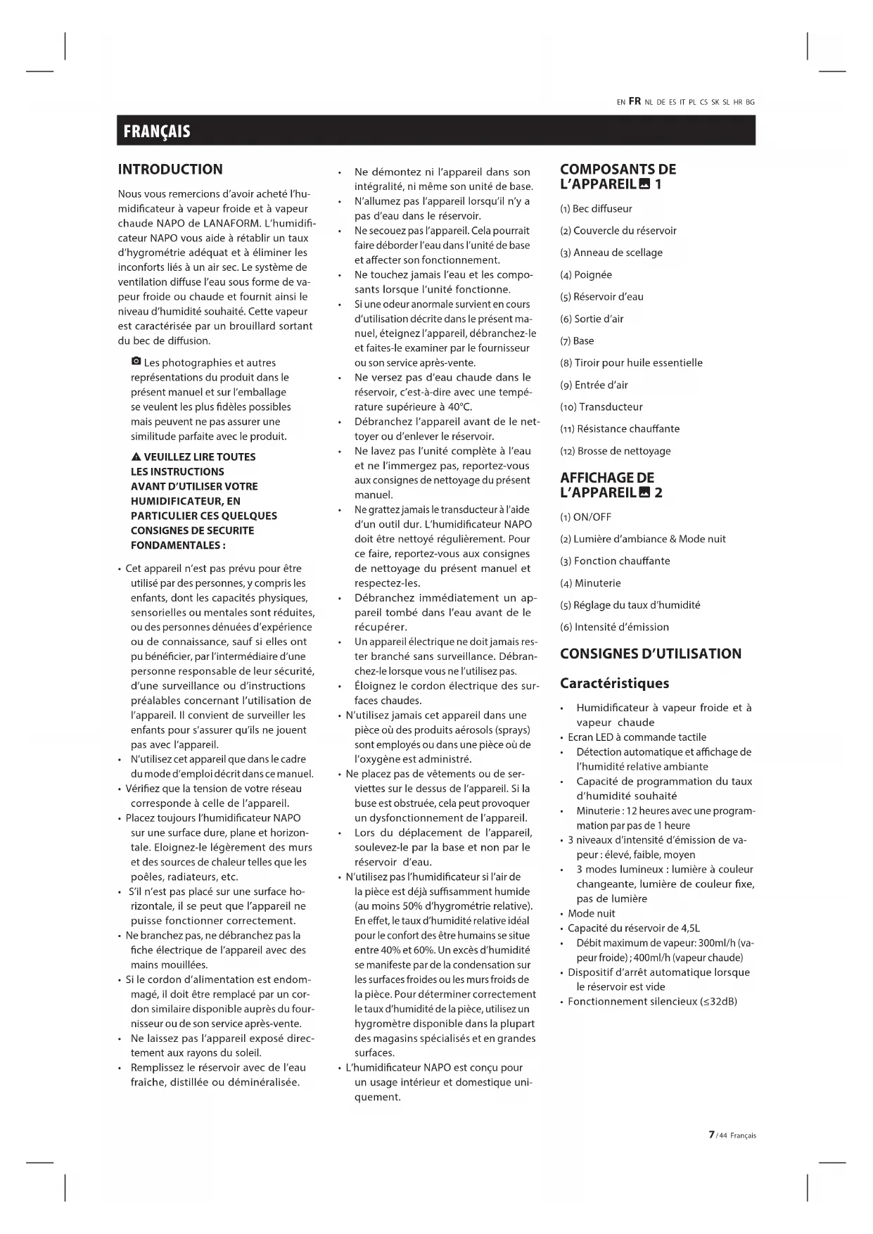 - Fonctionnement silencieux (≤32dB)Français 8 / 44 EN FR NL DE ES IT PL CS SK SL HR BG Diérences entre vapeur chaude et vapeur froide Enfant(s) en bas âge Préférez l’utilisation de la vapeur froide qui n’engendre pas de brûlure(s) en cas de chute ou de renversement de l’appareil. Entretien L’appareil diusant de la vapeur froide né- cessite d’être nettoyé plus régulièrement qu’un appareil diusant de la vapeur chaude. En eet, lors de la production de vapeur chaude, l’eau est chauée en passant par une résistance chauante qui élimine une grande quantité de bactéries. Le NAPO proposant ces deux fonctions, il sera très important de se reporter aux consignes d’entretien du présent manuel. Pièce où sera installé l’humidicateur La vapeur froide apportera une touche de fraîcheur dans une pièce étouante, sèche et mal aérée. La vapeur chaude, quant à elle, permettra de réchauer l’air d’une pièce fraîche. Consommation d’électricité La fonction vapeur chaude consomme plus d’énergie car il lui faut chauer l’eau. Préparation