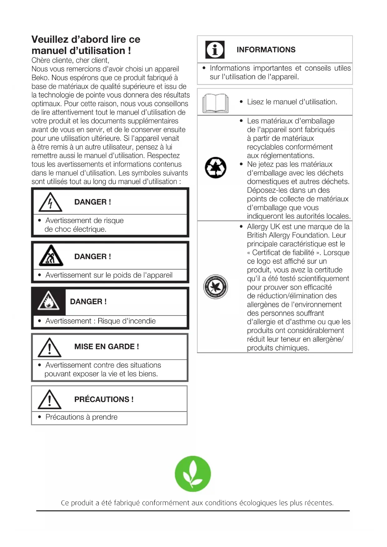 - Allergy UK est une marque de la British Allergy Foundation. Leur principale caractéristique est le « Certificat de fiabilité ». Lorsque ce logo est affiché sur un produit, vous avez la certitude qu'il a été testé scientifiquement pour prouver son efficacité de réduction/élimination des allergènes de l'environnement des personnes souffrant d'allergie et d'asthme ou que les produits ont considérablement réduit leur teneur en allergène/ produits chimiques.3 / FRLavante-Séchante / Manuel d’utilisation 1 Consignes importantes relatives à la sécurité et l'environnement Cette section comprend des consignes de sécurité qui vous aideront à vous protéger contre les risques de blessures corporelles ou de dégâts matériels. Le non-respect de ces consignes annulera toute garantie.