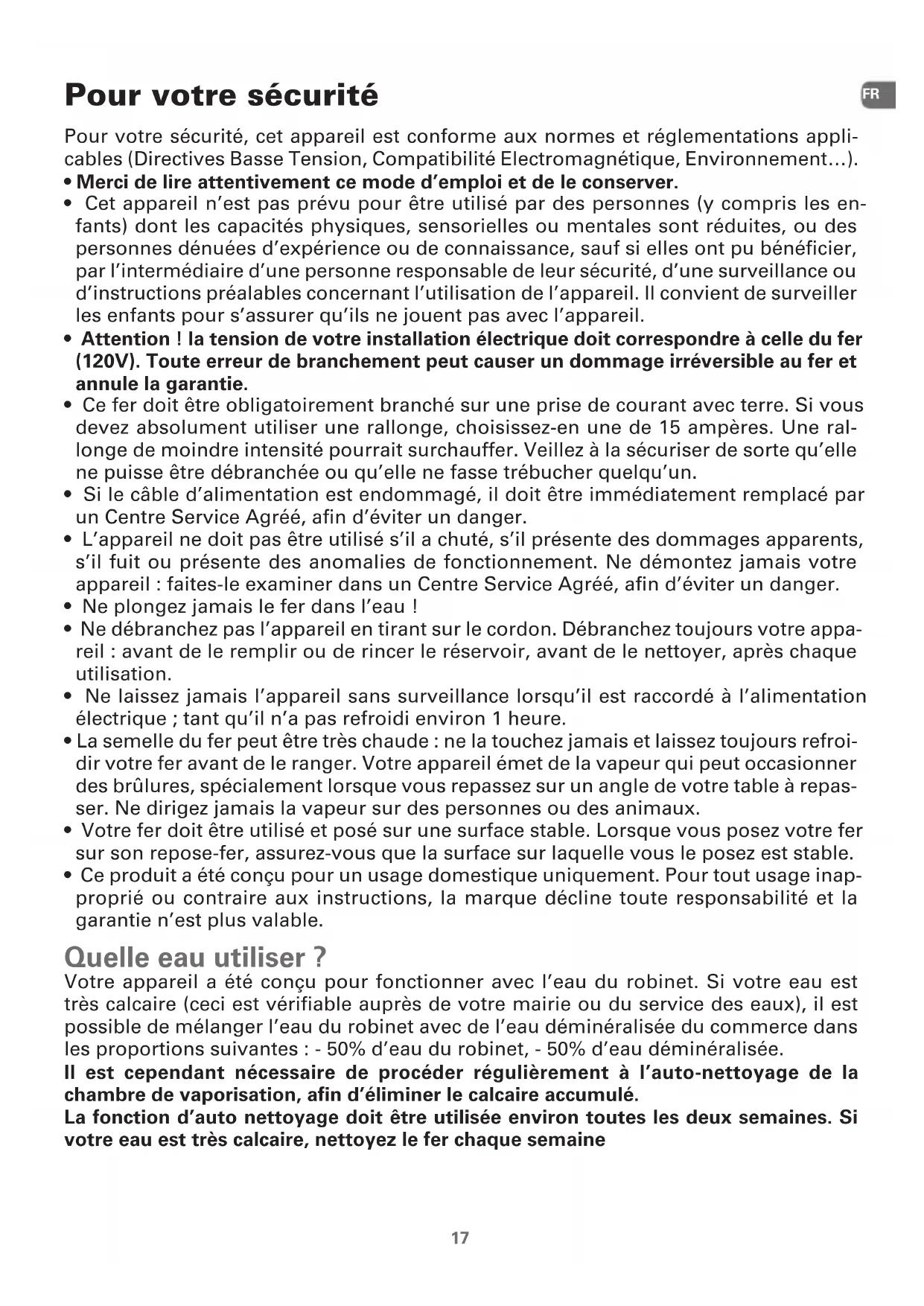 - Ce produit a été conçu pour un usage domestique uniquement. Pour tout usage inap- proprié ou contraire aux instructions, la marque décline toute responsabilité et la garantie n’est plus valable. Quelle eau utiliser ? Votre appareil a été conçu pour fonctionner avec l’eau du robinet. Si votre eau est très calcaire (ceci est vérifiable auprès de votre mairie ou du service des eaux), il est possible de mélanger l’eau du robinet avec de l’eau déminéralisée du commerce dans les proportions suivantes : - 50% d’eau du robinet, - 50% d’eau déminéralisée. Il est cependant nécessaire de procéder régulièrement à l’auto-nettoyage de la chambre de vaporisation, afin d’éliminer le calcaire accumulé. La fonction d’auto nettoyage doit être utilisée environ toutes les deux semaines. Si votre eau est très calcaire, nettoyez le fer chaque semaineQuelles eaux éviter ? La chaleur concentre les éléments contenus dans l’eau, lors de l’évaporation. Les eaux ci-dessous contiennent des déchets organiques ou des éléments minéraux qui peuvent provoquer des crachements, des coulures brunes ou un vieillissement prématuré de votre appareil : eau déminéralisée du commerce pure, eau des sèche-linges, eaux parfumées, eau adoucie, eau des réfrigérateurs, eau des batteries, eau des climatiseurs, eau distillée, eau de pluie. Nous vous demandons donc de ne pas utiliser de telles eaux. Environnement Participons à la protection de l’environnement !