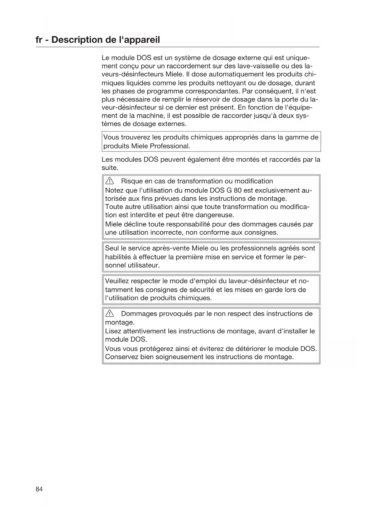 Le module DOS est un système de dosage externe qui est unique- ment conçu pour un raccordement sur des lave-vaisselle ou des la- veurs-désinfecteurs Miele. Il dose automatiquement les produits chi- miques liquides comme les produits nettoyant ou de dosage, durant les phases de programme correspondantes. Par conséquent, il n'est plus nécessaire de remplir le réservoir de dosage dans la porte du la- veur-désinfecteur si ce dernier est présent. En fonction de l'équipe- ment de la machine, il est possible de raccorder jusqu'à deux sys- tèmes de dosage externes. Vous trouverez les produits chimiques appropriés dans la gamme de produits Miele Professional. Les modules DOS peuvent également être montés et raccordés par la suite. Risque en cas de transformation ou modification Notez que l'utilisation du module DOS G 80 est exclusivement au- torisée aux fins prévues dans les instructions de montage. Toute autre utilisation ainsi que toute transformation ou modifica- tion est interdite et peut être dangereuse. Miele décline toute responsabilité pour des dommages causés par une utilisation incorrecte, non conforme aux consignes. Seul le service après-vente Miele ou les professionnels agréés sont habilités à effectuer la première mise en service et former le per- sonnel utilisateur. Veuillez respecter le mode d'emploi du laveur-désinfecteur et no- tamment les consignes de sécurité et les mises en garde lors de l'utilisation de produits chimiques. Dommages provoqués par le non respect des instructions de montage. Lisez attentivement les instructions de montage, avant d'installer le module DOS. Vous vous protégerez ainsi et éviterez de détériorer le module DOS. Conservez bien soigneusement les instructions de montage.fr - Description de l'appareil