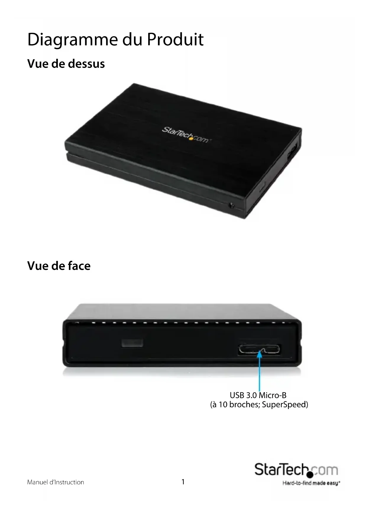 Diagramme du Produit Vue de dessus Vue de face USB 3.0 Micro-B (à 10 broches; SuperSpeed)Manuel d’Instruction
