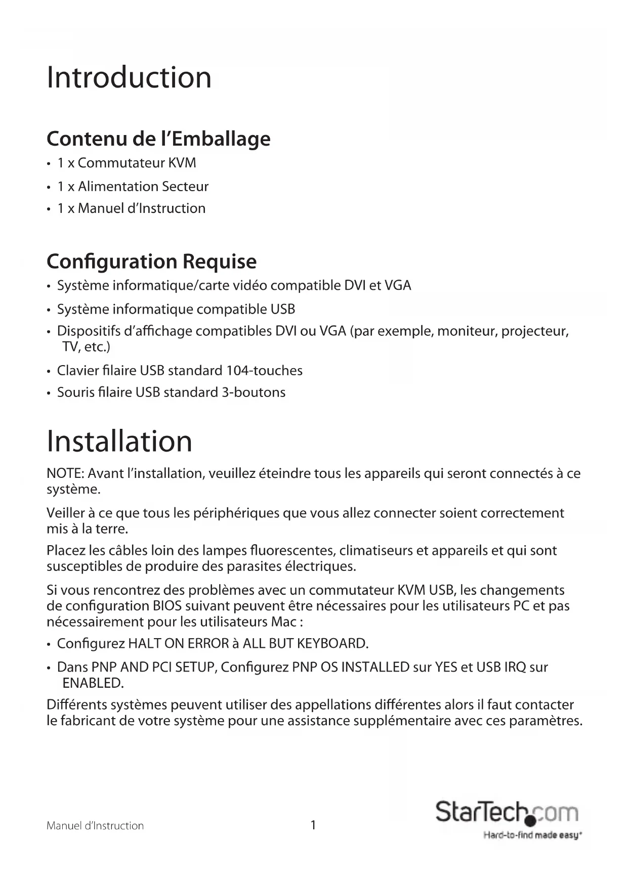 Révision du Manuel: 02/28/2011 Pour les informations les plus récentes, veuillez visiter www.startech.com DE: Bedienungsanleitung - de.startech.com FR: Guide de l'utilisateur - fr.startech.com ES: Guía del usuario - es.startech.com IT: Guida per l'uso - it.startech.com NL: Gebruiksaanwijzing - nl.startech.com PT: Guia do usuário - pt.startech.com SV231DDVDUA SV431DDVDUA Commutateur KVM USB, VGA et DVI 2/4-Port avec Audio et Hub USB 2.0 *Le produit actuel peut varier de la photoManuel d’Instruction Déclaration de conformité FCC Cet équipement a été testé et déclaré conforme en tant que dispositif numérique de classe B, conformément à la section 15 des règles FCC. Ces limites sont conçues pour fournir une protection raisonnable contre les interférences nuisibles dans une installation résidentielle. Cet équipement génère, utilise et peut émettre des fréquences radio et, s’il n’est pas installé et utilisé conformément aux instructions, il peut causer des interférences nuisibles aux communications radio. Cependant, il n’existe aucune garantie que des interférences ne se produiront pas dans une installation de type particulier. Si cet équipement provoque des interférences nuisibles à la réception de la radio ou de la télévision, pouvant être vérié en mettant l’équipement hors tension, l’utilisateur est encouragé à essayer de corriger l’interférence par une ou plusieurs des mesures suivantes: