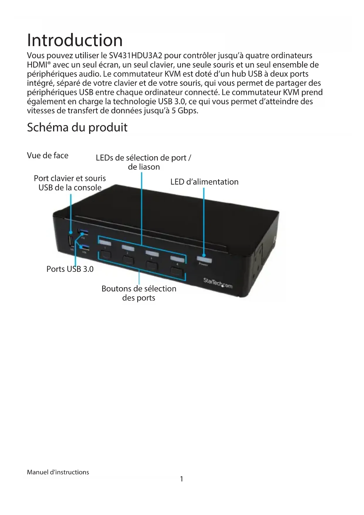 - Consulter votre revendeur ou un technicien radio / TV pour de l’aide. Utilisation des marques, marques déposées, et d’autres dénominations et symboles protégés Ce manuel peut faire référence à des marques, marques déposées, et d’autres dénominations et symboles protégés de sociétés tierces non liés en aucune façon à StarTech.com. Ces références sont à titre indicatif seulement et ne constituent pas une approbation d’un produit ou service par StarTech.com, ou un endossement du/des produit(s) auquel ce manuel s’applique par la société tierce en question. Indépendamment de toute reconnaissance directe dans le corps de manuel, StarTech.com reconnaît que toutes les marques, marques déposées, marques de service, et autres symboles et/ou dénominations protégées contenus dans ce manuel et les documents connexes sont la propriété de leurs détenteurs respectifs. Manuel d’instructionsTable of Contents Introduction ......................................................................................................... 1 Schéma du produit ................................................................................................................................... 1 Contenu de l’emballage ......................................................................................................................... 2 Conguration requise .............................................................................................................................2 À propos de l’USB 3.0 et de l’USB 3.1 Gén 1 ................................................................................... 3 Installation du commutateur KVM ............................................................... 3 Fixer les pieds en caoutchouc...............................................................................................................3 Connecter une console au commutateur KVM ..............................................................................3 Connecter des ordinateurs au commutateur KVM ....................................................................... 3 À propos des adaptateurs vidéo..........................................................................................................4 À propos des pilotes ................................................................................................................................4 Dépannage .................................................................................................................................................. 4 Utilisation du commutateur KVM ................................................................. 5 À propos des indicateurs LED ..............................................................................................................5 Sélectionner un port ............................................................................................................................... 5 Démarrer la fonction AutoScan .......................................................................................................... 5 Modier le temps d’intervalle de l’AutoScan .................................................................................. 6 À propos de la fonction USB HID virtuel ........................................................................................... 6 Utilisation des raccourcis clavier ................................................................... 6 Activer les commandes des raccourcis clavier ...............................................................................7 Sélectionner un port ............................................................................................................................... 7 Démarrer la fonction AutoScan .......................................................................................................... 7 Modier le temps d’intervalle de l’AutoScan ................................................................................. 7 Démarrer un balayage manuel ........................................................................................................... 8 Activer le verrouillage audio ................................................................................................................ 8 Autres commandes de raccourcis clavier ........................................................................................8 Support Technique ............................................................................................ 9 Informations sur la Garantie ........................................................................... 9Port clavier et souris USB de la console Ports USB 3.0 Boutons de sélection des ports LED d’alimentation Vue de face LEDs de sélection de port / de liason Manuel d’instructions