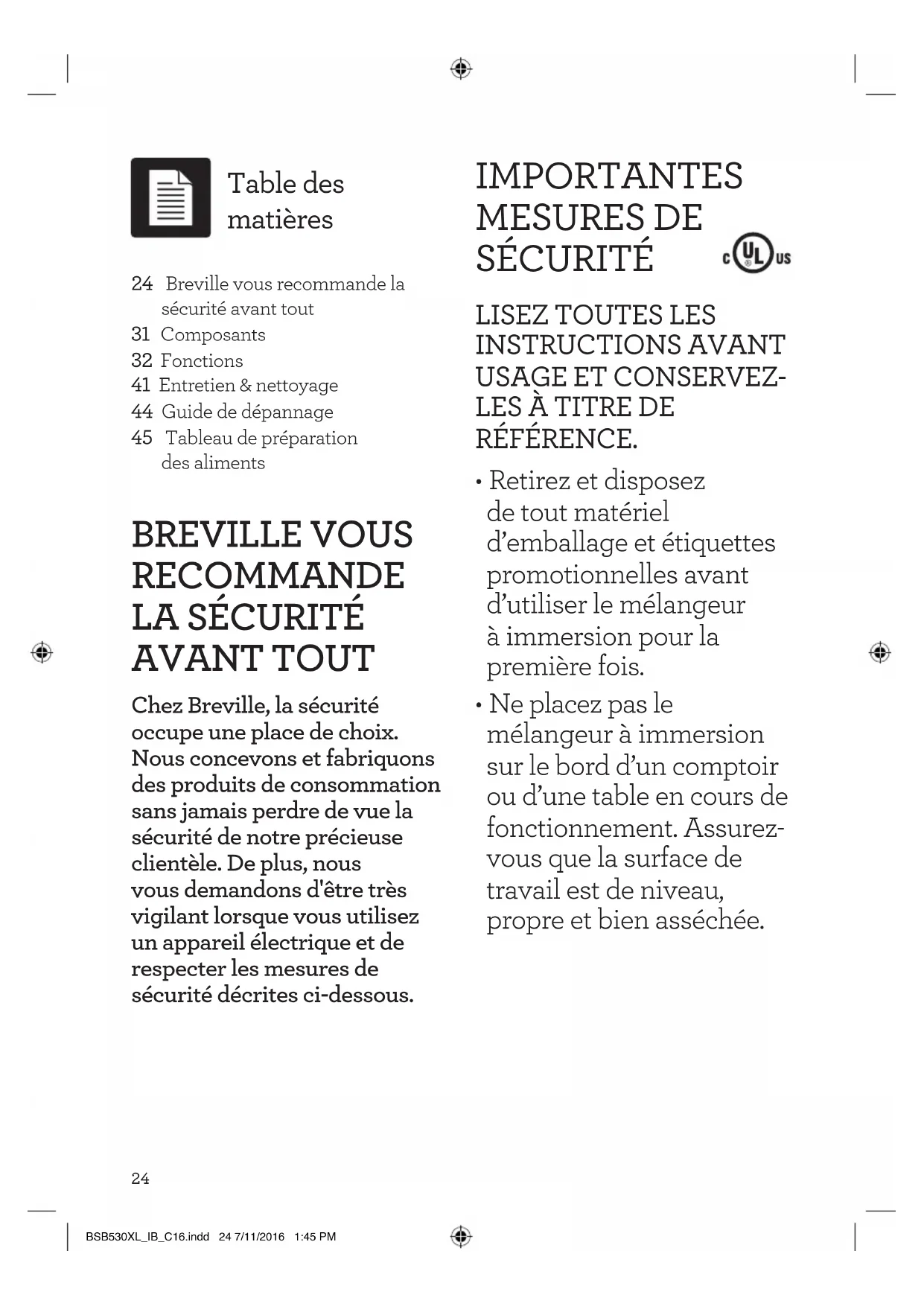 - Ne placez pas le mélangeur à immersion sur le bord d’un comptoir ou d’une table en cours de fonctionnement. Assurez- vous que la surface de travail est de niveau, propre et bien asséchée. 24 Breville vous recommande la sécurité avant tout 31 Composants 32 Fonctions 41 Entretien & nettoyage 44 Guide de dépannage 45 Tableau de préparation des aliments Table des matières BSB530XL_IB_C16.indd 24 7/11/2016 1:45 PM25