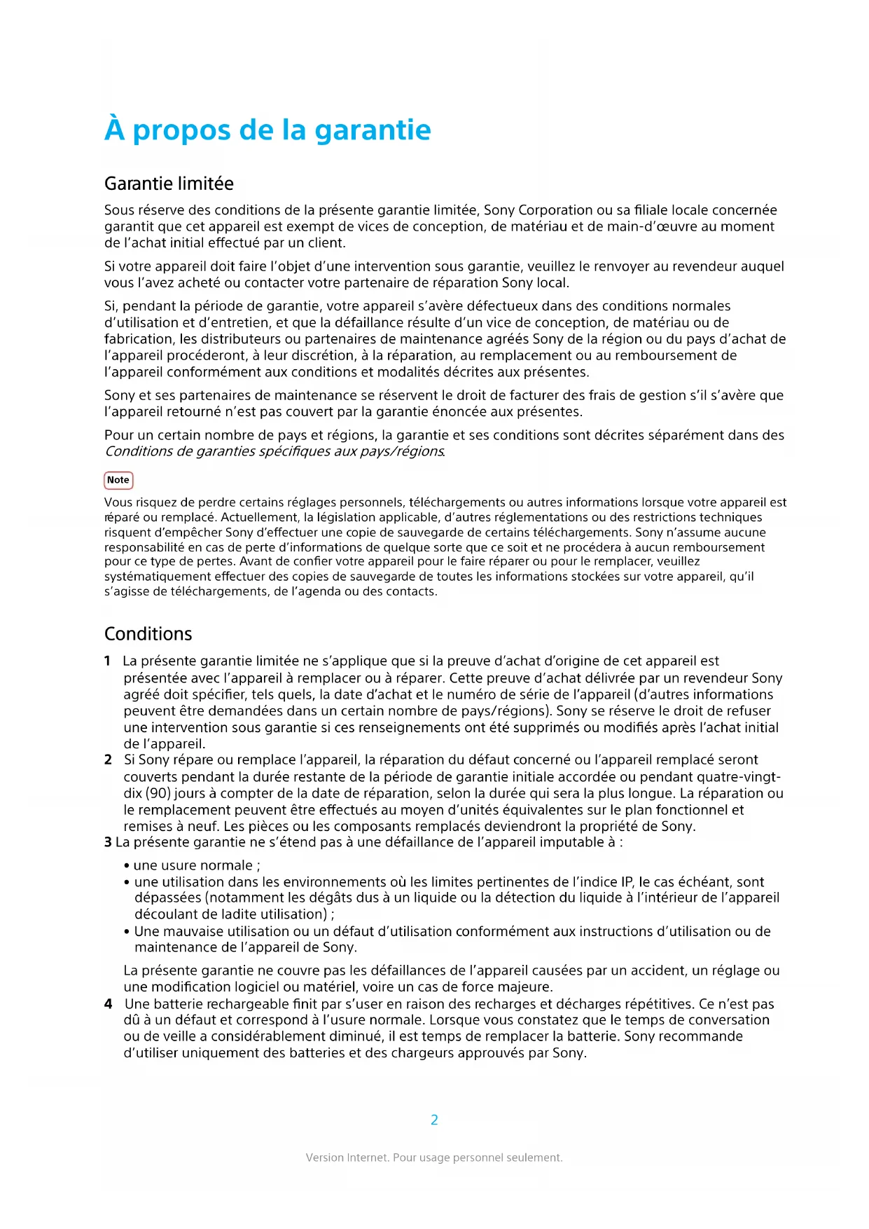 ersion Internet. Pour usage personnel seulement.risquent d’empêcher Sony d ’eectuer une copie de sauvegarde de certains téléchargements. Sony n’assume aucune responsabilité en cas de perte d’informations de quelque sorte que ce soit et ne procédera à aucun remboursement pour ce type de pertes. Avant de coner votre appareil pour le faire réparer ou remplacer, veuillez systématiquement eectuer des copies de sauvegarde de toutes les informations stockées sur votre appareil, qu’il s’agisse de téléchargements, du calendrier ou des contacts. Garantie limitée pour Taïwan Sous réserve des conditions de la présente garantie limitée, Sony Corporation ou sa liale locale concernée garantit que cet appareil est exempt de vices de conception, de matériau et de main-d’œuvre au moment de l’achat initial eectué par un client, et ce, pour une durée d’un (1) an à partir de la date d’achat. Tous les accessoires d’origine livrés avec l’appareil sont garantis pour une période de six (6) mois à compter de la date d’achat. Si, pendant la période de garantie, cet appareil s’avère défectueux dans des conditions normales d’utilisation et d’entretien, et que la défaillance résulte d’un vice de conception, de matériau ou de fabrication, les distributeurs ou partenaires de maintenance agréés Sony de la région ou du pays d’achat de l’appareil produit procéderont, à leur discrétion, à la réparation, au remplacement ou au remboursement de l’appareil conformément aux conditions et modalités stipulées aux présentes. Note Vous risquez de perdre certains réglages personnels, téléchargements ou autres informations lorsque votre appareil est