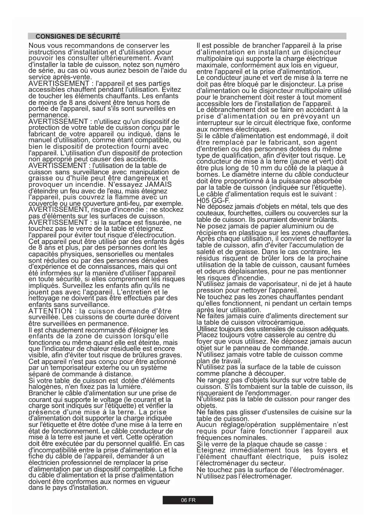 Ne faites jamais cuire d'aliments directement sur la table de cuisson vitrocéramique. Placez toujours votre casserole au centre du foyer que vous utilisez. Ne déposez jamais aucun objet sur le panneau de commande. N'utilisez pas la surface de la table de cuisson comme planche à découper. Le conducteur jaune et vert de mise à la terre ne doit pas être bloqué par le disjoncteur. La prise d'alimentation ou le disjoncteur multipolaire utilisé pour le branchement doit rester à tout moment accessible lors de l'installation de l'appareil. Après chaque utilisation, il convient de nettoyer la table de cuisson, afin d'éviter l'accumulation de saleté et de graisse. Dans le cas contraire, les résidus risquent de brûler lors de la prochaine utilisation de la table de cuisson, causant fumées et odeurs déplaisantes, pour ne pas mentionner les risques d'incendie. H05 GG-F. Le débranchement doit se faire en accédant à la prise d'alimentation ou en prévoyant un interrupteur sur le circuit électrique fixe, conforme aux normes électriques. Si le câble d'alimentation est endommagé, il doit être remplacé par le fabricant, son agent d'entretien ou des personnes dotées du même type de qualification, afin d'éviter tout risque. Le conducteur de mise à la terre (jaune et vert) doit être plus long de 10 mm du côté de la plaque à bornes. Le diamètre interne du câble conducteur doit être proportionné à la puissance absorbée par la table de cuisson (indiquée sur l'étiquette). Le câble d'alimentation requis est le suivant : Ne posez jamais de papier aluminium ou de récipients en plastique sur les zones chauffantes. Ne déposez jamais d'objets en métal, tels que des couteaux, fourchettes, cuillers ou couvercles sur la table de cuisson. Ils pourraient devenir brûlants. N'utilisez jamais de vaporisateur, ni de jet à haute pression pour nettoyer l'appareil. Il est possible de brancher l'appareil à la prise d'alimentation en installant un disjoncteur multipolaire qui supporte la charge électrique maximale, conformément aux lois en vigueur, entre l'appareil et la prise d'alimentation. Ne touchez pas les zones chauffantes pendant qu'elles fonctionnent, ni pendant un certain temps après leur utilisation. Utilisez toujours des ustensiles de cuisson adéquats. N'utilisez jamais votre table de cuisson comme plan de travail. Ne rangez pas d'objets lourds sur votre table de cuisson. S'ils tombaient sur la table de cuisson, ils risqueraient de l'endommager. N'utilisez pas la table de cuisson pour ranger des objets. Ne faites pas glisser d'ustensiles de cuisine sur la table de cuisson. Sle verre de la plaque chaude se casse : Étegnez mmédatement tous les foyers et l'élément chauffant électrque, pussolez l’électroménager du secteur. Ne touchez pas la surface de l’électroménager. N’utlsez pas l’électroménager. Aucun réglage/opératon supplémentare n’est requs pour fare fonctonner l’apparel aux fréquences nomnales.07 FR Lors de la mise en place du joint sur la partie arrière, veiller à ne pasobstruer les passages d'air nécessaires à la combustion. Le meuble ou le support dans lequel doit être encastrée la table, ainsi que les parois du meuble qui pourraient juxtaposer celui-ci, doivent êtred'une matière résistant à une température élevée (jusqu'à 100°C) etd'une épaisseur comprise entre 25 et 45 mm.Les dimensions d'encastrement sont indiquées sur le .schéma 2Si, en fonction de l'installation de la table, la partie inférieure de son caisson se trouve à proximité d'une zone normalement accessible lors de manipulations et/ou de rangements, placer une cloison (bois ousimilaire) pour éviter tous risques de brûlure ou de détérioration().schéma 3Si la table est installée entre deux meubles de cuisine, la distance entrela table et les meubles doit être au moins de 17 cm ( );tandis que la distance entre la table et le mur du fond doit être au moinsde 7 cm. La distance entre la table et tout autre appareil ou meuble situé au dessus (par exemple une hotte) doit être au moins de 70 cm