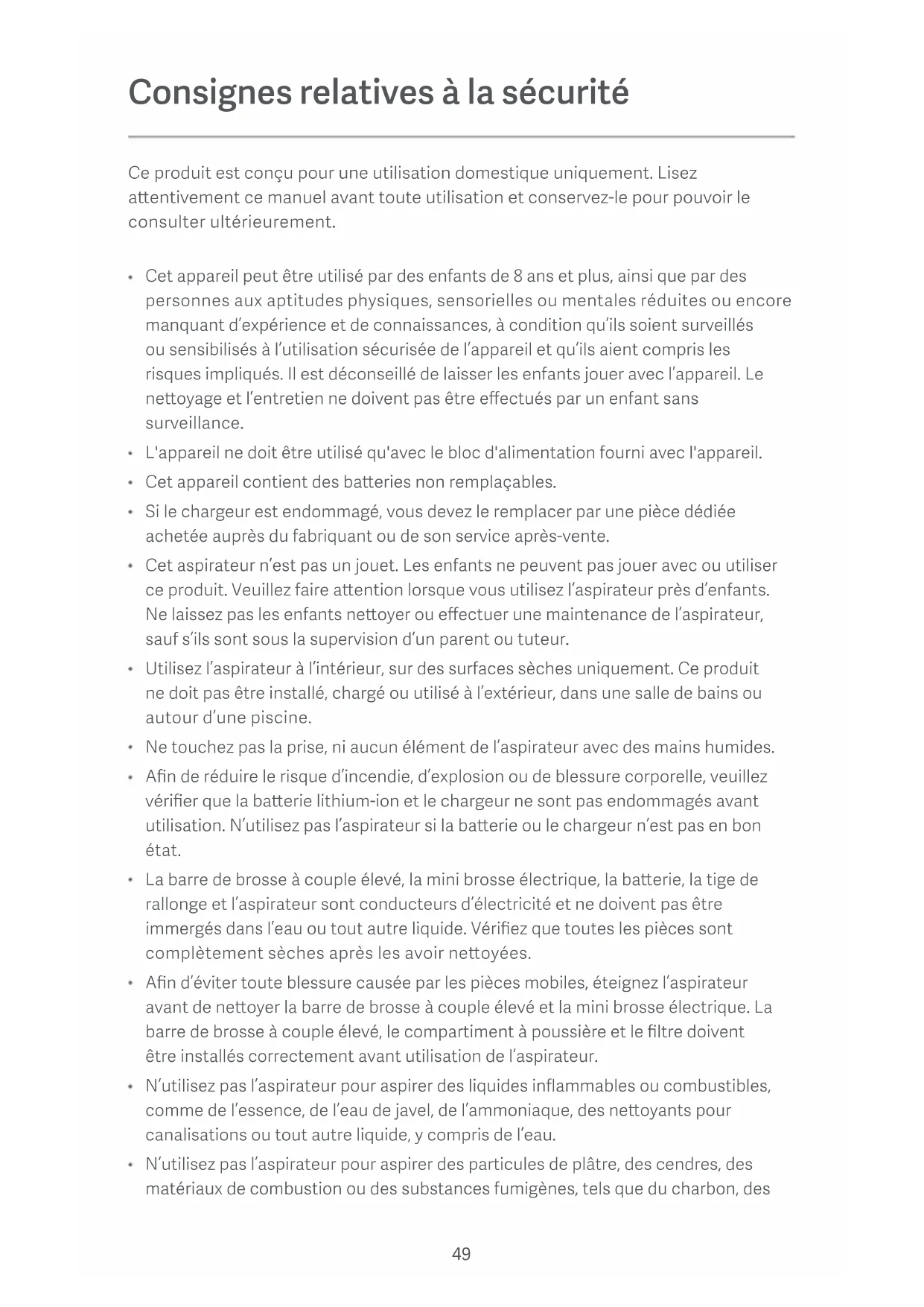 L'aspirapolvere è in modalità standby e non può essere utilizzato durante la ricarica. La baeria agli ioni di litio contiene sostanze pericolose per l'ambiente. Prima di geare via l'aspirapolvere, rimuovere la baeria, quindi smaltirlo o riciclarlo in conformità alle leggi e alle normative locali del Paese o dell'area in cui viene utilizzato. Nota: L'aspirapolvere deve essere spento prima di rimuovere la baeria. La baeria deve essere smaltita in modo sicuro.49 Consignes relatives à la sécurité Ce produit est conçu pour une utilisation domestique uniquement. Lisez aentivement ce manuel avant toute utilisation et conservez-le pour pouvoir le consulter ultérieurement. Cet appareil peut être utilisé par des enfants de8ans et plus, ainsi que par des personnes aux aptitudes physiques, sensorielles ou mentales réduites ou encore manquant d’expérience et de connaissances, à condition qu’ils soient surveillés ou sensibilisés à l’utilisation sécurisée de l’appareil et qu’ils aient compris les risques impliqués. Il est déconseillé de laisser les enfants jouer avec l’appareil. Le neoyage et l’entretien ne doivent pas être effectués par un enfant sans surveillance. L'appareil ne doit être utilisé qu'avec le bloc d'alimentation fourni avec l'appareil. Cet appareil contient des baeries non remplaçables. Si le chargeur est endommagé, vous devez le remplacer par une pièce dédiée achetée auprès du fabriquant ou de son service après-vente. Cet aspirateur n’est pas un jouet. Les enfants ne peuvent pas jouer avec ou utiliser ce produit. Veuillez faire aention lorsque vous utilisez l’aspirateur près d’enfants. Ne laissez pas les enfants neoyer ou effectuer une maintenance de l’aspirateur, sauf s’ils sont sous la supervision d’un parent ou tuteur. Utilisez l’aspirateur à l’intérieur, sur des surfaces sèches uniquement. Ce produit ne doit pas être installé, chargé ou utilisé à l’extérieur, dans une salle de bains ou autour d’une piscine. Ne touchez pas la prise, ni aucun élément de l’aspirateur avec des mains humides. Afin de réduire le risque d’incendie, d’explosion ou de blessure corporelle, veuillez vérifier que la baerie lithium-ion et le chargeur ne sont pas endommagés avant utilisation. N’utilisez pas l’aspirateur si la baerie ou le chargeur n’est pas en bon état. La barre de brosse à couple élevé, la mini brosse électrique, la baerie, la tige de rallonge et l’aspirateur sont conducteurs d’électricité et ne doivent pas être immergés dans l’eau ou tout autre liquide. Vérifiez que toutes les pièces sont complètement sèches après les avoir neoyées. Afin d’éviter toute blessure causée par les pièces mobiles, éteignez l’aspirateur avant de neoyer la barre de brosse à couple élevé et la mini brosse électrique. La barre de brosse à couple élevé, le compartiment à poussière et le filtre doivent être installés correctement avant utilisation de l’aspirateur. N’utilisez pas l’aspirateur pour aspirer des liquides inflammables ou combustibles, comme de l’essence, de l’eau de javel, de l’ammoniaque, des neoyants pour canalisations ou tout autre liquide, y compris de l’eau. N’utilisez pas l’aspirateur pour aspirer des particules de plâtre, des cendres, des matériaux de combustion ou des substances fumigènes, tels que du charbon, des50 mégots de cigaree ou des allumees. N’utilisez pas l’aspirateur pour aspirer des objets durs ou pointus, comme du verre, des clous, des vis ou des pièces de monnaie, sous peine d’endommager le produit. Gardez les cheveux, les vêtements, les doigts ou autre partie du corps à l’écart des éléments mobiles ou pouvant s’ouvrir. Ne pointez pas le suceur, le tube ni tout autre accessoire vers vos yeux ou vos oreilles. Ne les meez pas dans votre bouche. Ne placez aucun objet dans les orifices de l’aspirateur. N’utilisez pas l’aspirateur en cas d’obstruction d’un des orifices. Retirez la poussière, les peluches, les cheveux ou tout autre élément susceptible de réduire le flux d’air. Ne posez pas l’aspirateur contre une chaise, une table ou toute autre surface instable, car cela pourrait endommager le produit ou entraîner des blessures corporelles. Si l’aspirateur fonctionne mal après être tombé ou avoir été endommagé, veuillez contacter le service après-vente agréé. Ne tentez jamais de démonter l’appareil vous-même. Utilisez uniquement le chargeur d'origine pour charger le produit dans les environnements ayant une température ambiante de 0 °C à 35°C. Sinon, la baerie risque de subir des dommages. Le compartiment à poussière, le filtre en coton, le séparateur à cyclone et le filtre doivent être convenablement installés avant d'utiliser l'aspirateur. Veillez à débrancher l’aspirateur lorsqu’il n’est pas utilisé pendant une période prolongée ou avant tout entretien ou toute réparation. Soyez extrêmement vigilant lorsque vous utilisez l’aspirateur pour neoyer un escalier.