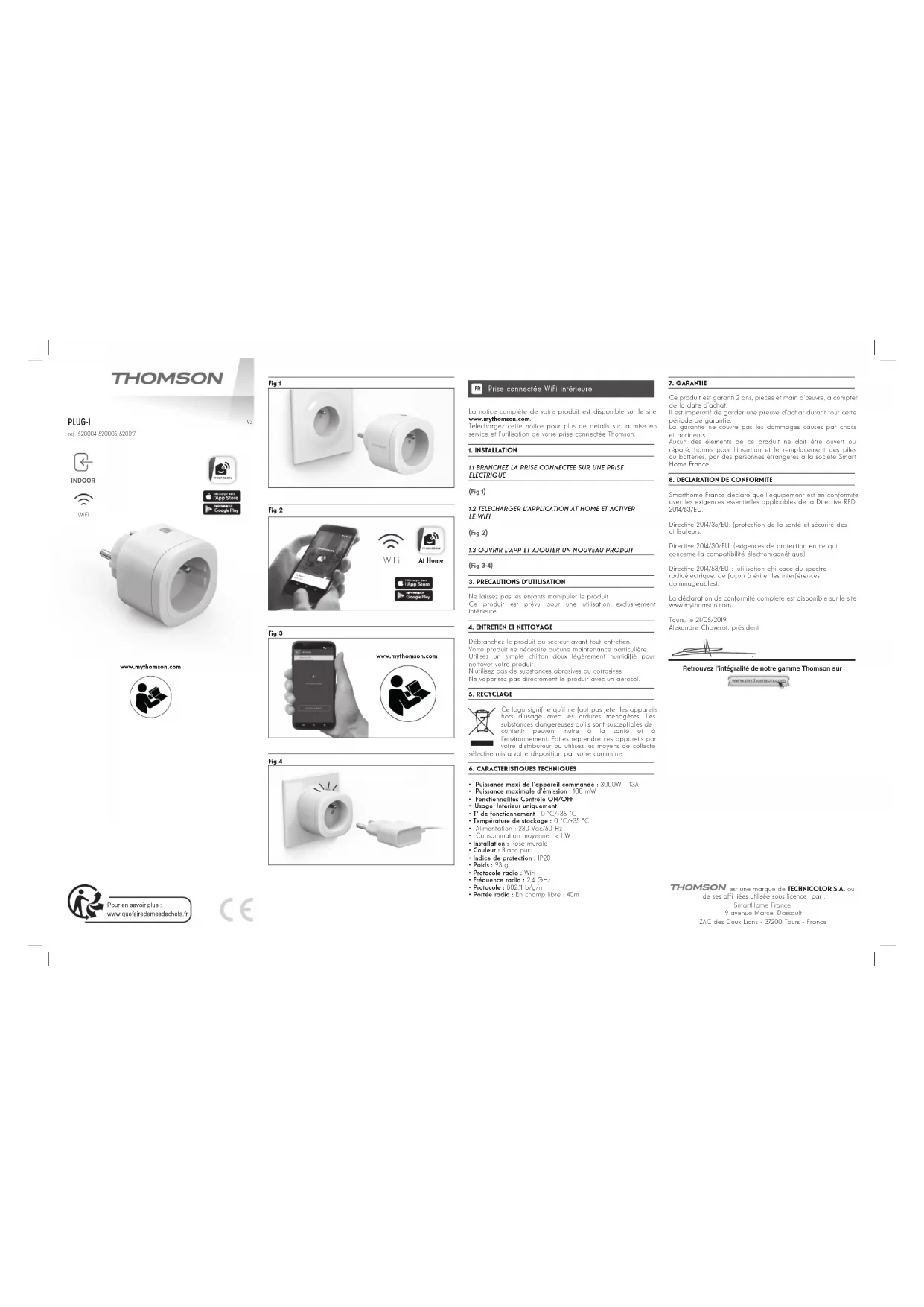 Smarthome France déclare que l’équipement est en conformité avec les exigences essentielles applicables de la Directive RED 2014/53/EU. Directive 2014/35/EU: (protection de la santé et sécurité des utilisateurs. Directive 2014/30/EU: (exigences de protection en ce qui concerne la compatibilité électromagnétique). Directive 2014/53/EU : (utilisation effi cace du spectre radioélectrique, de façon à éviter les interférences dommageables). La déclaration de conformité complète est disponible sur le site www.mythomson.com Tours, le 21/05/2019 Alexandre Chaverot, président Retrouvez l’intégralité de notre gamme Thomson sur Pour en savoir plus : www.quefairedemesdechets.fr est une marque de TECHNICOLOR S.A. ou de ses affi liées utilisée sous licence par : SmartHome France 19 avenue Marcel Dassault ZAC des Deux Lions - 37200 Tours - France WiFi INDOOR Fig 1 Fig 2 At Home WiFi Fig 3 www.mythomson.com. Fig 4 www.mythomson.com.Indoor WiFi plug Smartplug Wifi binnenshuis GB NL Full instructions for your product are available on the website: www.mythomson.com. Download these instructions for more details on setting up and using your Thomson plug.