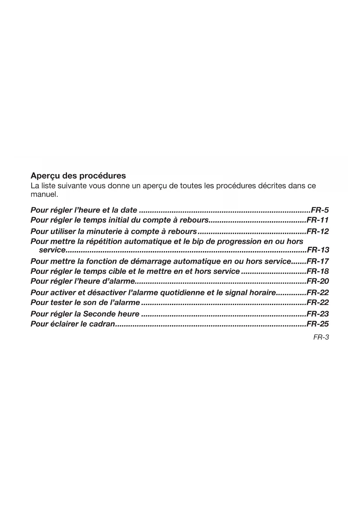 - Chaque section de cette notice fournit les informations nécessaires sur les opérations pouvant être effectuées dans chaque mode.FR-2 Sommaire À propos de ce manuel .........................................................................................FR-1 Fonctions de la montre .........................................................................................FR-4 Réglage de l’heure et de la date ..........................................................................FR-5 Sélection d’un mode .............................................................................................FR-8 Mode Minuterie ....................................................................................................FR-11 Mode Chronomètre .............................................................................................FR-15 Mode Alarme ........................................................................................................FR-20 Mode Seconde heure ..........................................................................................FR-23 Éclairage...............................................................................................................FR-25 Fiche technique ...................................................................................................FR-26 Précautions d’emploi ..........................................................................................FR-28 Entretien de la montre ........................................................................................FR-39FR-3 Aperçu des procédures La liste suivante vous donne un aperçu de toutes les procédures décrites dans ce manuel. Pour régler l’heure et la date ...............................................................................FR-5 Pour régler le temps initial du compte à rebours .............................................FR-11 Pour utiliser la minuterie à compte à rebours ..................................................FR-12 Pour mettre la répétition automatique et le bip de progression en ou hors service ...............................................................................................................FR-13 Pour mettre la fonction de démarrage automatique en ou hors service .......FR-17 Pour régler le temps cible et le mettre en et hors service ..............................FR-18 Pour régler l’heure d’alarme...............................................................................FR-20 Pour activer et désactiver l’alarme quotidienne et le signal horaire ..............FR-22 Pour tester le son de l’alarme ............................................................................FR-22 Pour régler la Seconde heure ............................................................................FR-23 Pour éclairer le cadran ........................................................................................FR-25FR-4 Fonctions de la montre