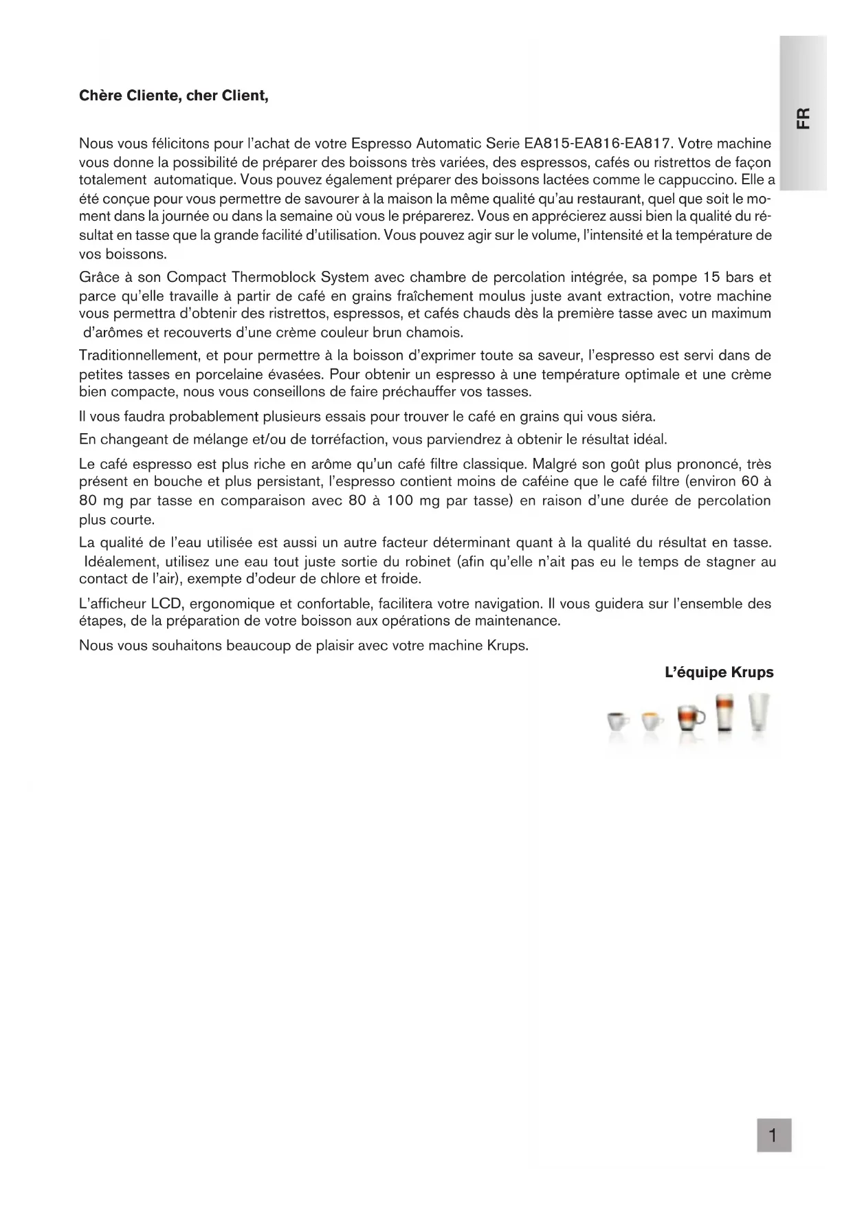 Chère Cliente, cher Client, Nous vous félicitons pour l’achat de votre Espresso Automatic Serie EA815-EA816-EA817. Votre machine vous donne la possibilité de préparer des boissons très variées, des espressos, cafés ou ristrettos de façon totalement automatique. Vous pouvez également préparer des boissons lactées comme le cappuccino. Elle a été conçue pour vous permettre de savourer à la maison la même qualité qu’au restaurant, quel que soit le mo- ment dans la journée ou dans la semaine où vous le préparerez. Vous en apprécierez aussi bien la qualité du ré- sultat en tasse que la grande facilité d’utilisation. Vous pouvez agir sur le volume, l’intensité et la température de vos boissons. Grâce à son Compact Thermoblock System avec chambre de percolation intégrée, sa pompe 15 bars et parce qu’elle travaille à partir de café en grains fraîchement moulus juste avant extraction, votre machine vous permettra d’obtenir des ristrettos, espressos, et cafés chauds dès la première tasse avec un maximum d’arômes et recouverts d’une crème couleur brun chamois. Traditionnellement, et pour permettre à la boisson d’exprimer toute sa saveur, l’espresso est servi dans de petites tasses en porcelaine évasées. Pour obtenir un espresso à une température optimale et une crème bien compacte, nous vous conseillons de faire préchauffer vos tasses. Il vous faudra probablement plusieurs essais pour trouver le café en grains qui vous siéra. En changeant de mélange et/ou de torréfaction, vous parviendrez à obtenir le résultat idéal. Le café espresso est plus riche en arôme qu’un café filtre classique. Malgré son goût plus prononcé, très présent en bouche et plus persistant, l’espresso contient moins de caféine que le café filtre (environ 60 à 80 mg par tasse en comparaison avec 80 à 100 mg par tasse) en raison d’une durée de percolation plus courte. La qualité de l’eau utilisée est aussi un autre facteur déterminant quant à la qualité du résultat en tasse. Idéalement, utilisez une eau tout juste sortie du robinet (afin qu’elle n’ait pas eu le temps de stagner au contact de l’air), exempte d’odeur de chlore et froide. L’afficheur LCD, ergonomique et confortable, facilitera votre navigation. Il vous guidera sur l’ensemble des étapes, de la préparation de votre boisson aux opérations de maintenance. Nous vous souhaitons beaucoup de plaisir avec votre machine Krups. L’équipe Krups2