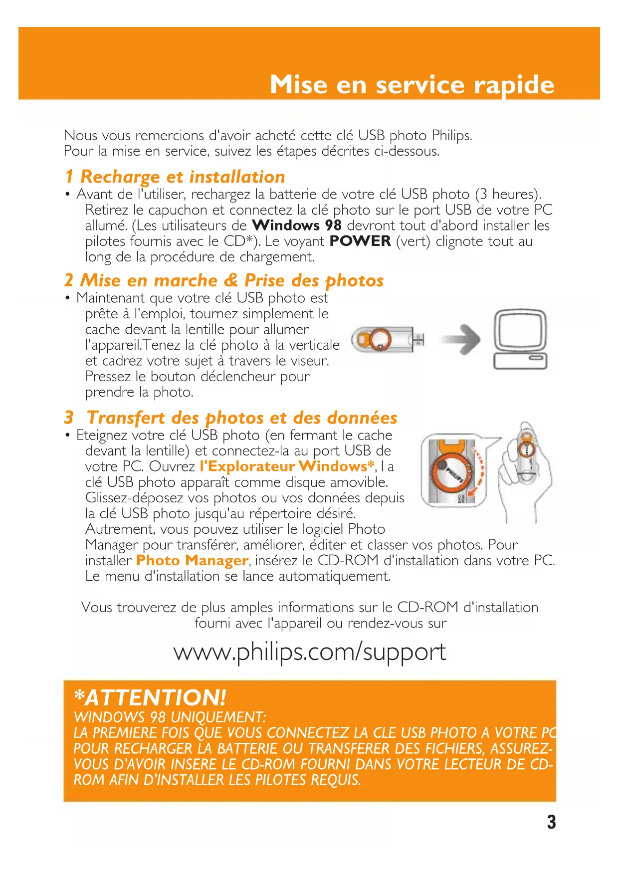 - Eteignez votre clé USB photo (en fermant le cache devant la lentille) et connectez-la au port USB de votre PC. Ouvrez l'Explorateur Windows*,la clé USB photo apparaît comme disque amovible. Glissez-déposez vos photos ou vos données depuis la clé USB photo jusqu'au répertoire désiré. Autrement, vous pouvez utiliser le logiciel Photo Manager pour transférer, améliorer, éditer et classer vos photos. Pour installer Photo Manager, insérez le CD-ROM d'installation dans votre PC. Le menu d'installation se lance automatiquement. Vous trouverez de plus amples informations sur le CD-ROM d'installation fourni avec l'appareil ou rendez-vous sur www.philips.com/support4 Sécurité et entretien Consignes de sécurité relatives à l'utilisation du KEY