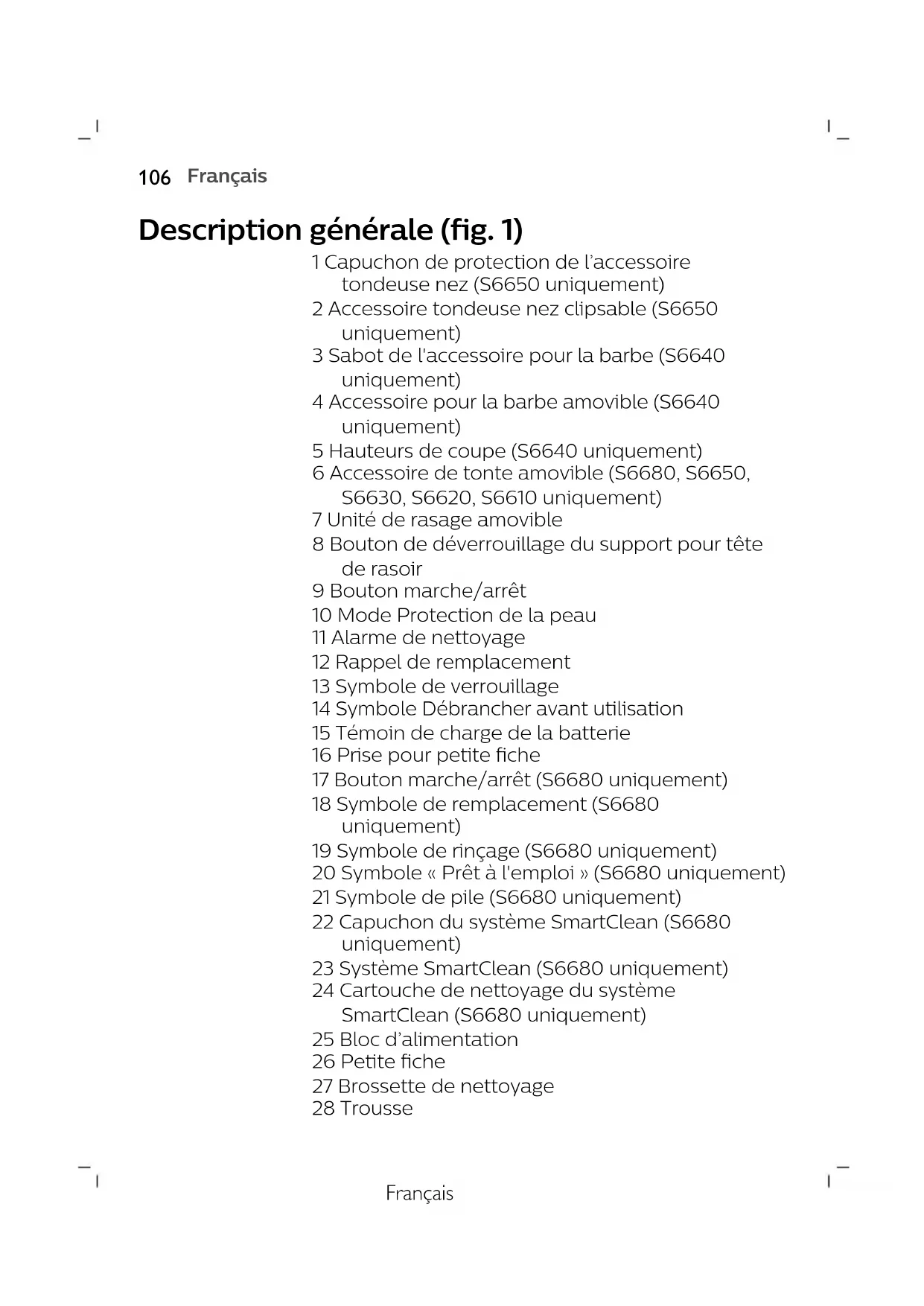 EspañolFrançais Description générale (fig. 1) 1 Capuchon de protection de l’accessoire tondeuse nez (S6650 uniquement) 2 Accessoire tondeuse nez clipsable (S6650 uniquement) 3 Sabot de l'accessoire pour la barbe (S6640 uniquement) 4 Accessoire pour la barbe amovible (S6640 uniquement) 5 Hauteurs de coupe (S6640 uniquement) 6 Accessoire de tonte amovible (S6680, S6650, S6630, S6620, S6610 uniquement) 7 Unité de rasage amovible 8 Bouton de déverrouillage du support pour tête de rasoir 9 Bouton marche/arrêt 10 Mode Protection de la peau 11 Alarme de nettoyage 12 Rappel de remplacement 13 Symbole de verrouillage 14 Symbole Débrancher avant utilisation 15 Témoin de charge de la batterie 16 Prise pour petite fiche 17 Bouton marche/arrêt (S6680 uniquement) 18 Symbole de remplacement (S6680 uniquement) 19 Symbole de rinçage (S6680 uniquement) 20 Symbole «Prêt à l'emploi» (S6680 uniquement) 21 Symbole de pile (S6680 uniquement) 22 Capuchon du système SmartClean (S6680 uniquement) 23 Système SmartClean (S6680 uniquement) 24 Cartouche de nettoyage du système SmartClean (S6680 uniquement) 25 Bloc d’alimentation 26 Petite fiche 27 Brossette de nettoyage 28 Trousse