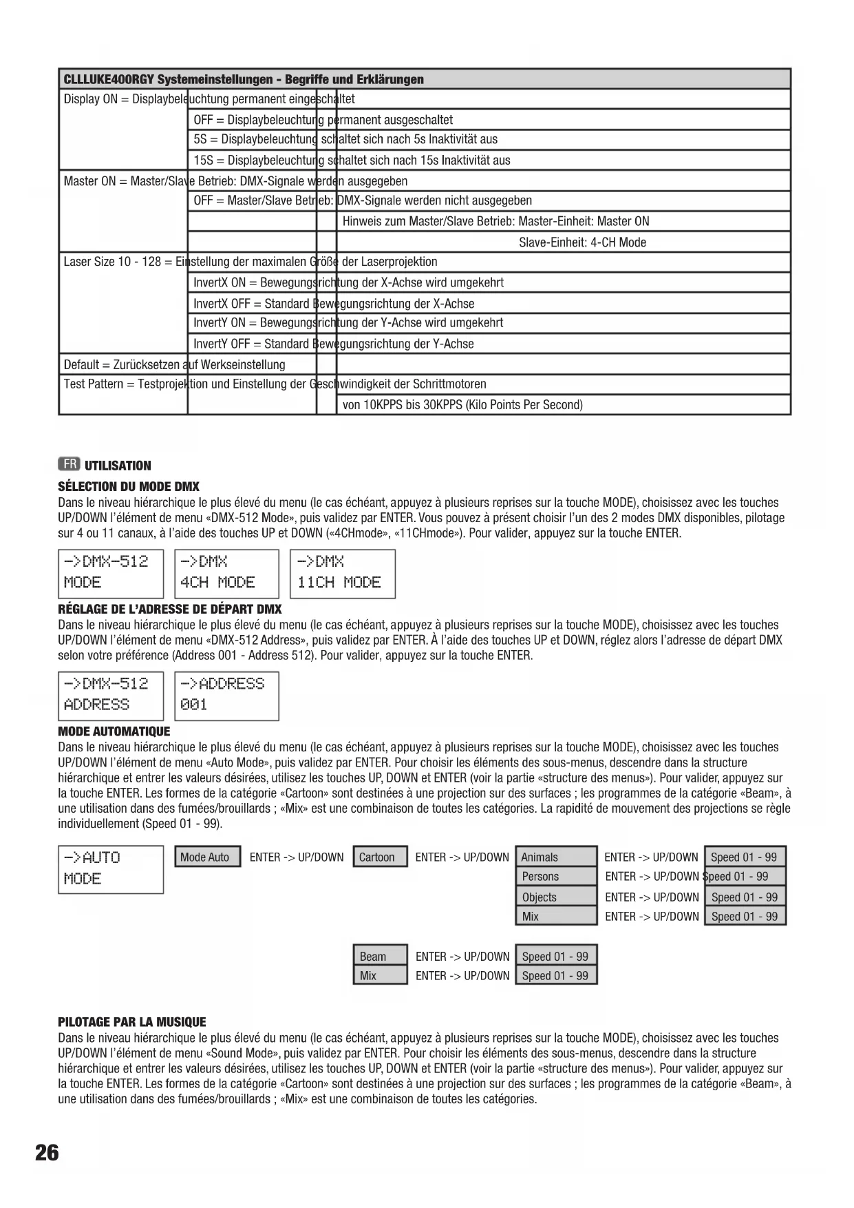 15S Master ENTER -> UP/DOWN ON OFF Laser ENTER -> UP/DOWN Size ENTER -> UP/DOWN Size 10 - 128 InvertX ENTER -> UP/DOWN ON OFF InvertY ENTER -> UP/DOWN ON OFF Default ENTER Test Pattern ENTER -> UP/DOWN Scanner 10 - 30KPPS29 Paramètres système CLLLUKE400RGY - Concepts et précisions Display ON = Le rétro-éclairage de l'afficheur LCD est allumé en permanence. OFF = Le rétro-éclairage de l'afficheur LCD est éteint en permanence. 5S = Le rétro-éclairage de l'afficheur LCD s'éteint automatiquement au bout de 5 secondes d'inactivité. 15S = Le rétro-éclairage de l'afficheur LCD s'éteint automatiquement au bout de 15 secondes d'inactivité. Master ON = Utilisation Master / Slave : Les signaux DMX sont émis. OFF = Utilisation Master / Slave : Aucun signal DMX n'est émis. Conseils d'utilisation en mode Master/Slave : Appareil Master : Master ON Appareil Slave : Mode 4-CH Laser Size 10 - 128 = Réglage de la taille maximale de la projection laser InvertX ON = inversion du sens du mouvement sur l'axe des X InvertX OFF = sens de mouvement normal sur l'axe des X InvertY ON = inversion du sens du mouvement sur l'axe des Y InvertY OFF = sens de mouvement normal sur l'axe des Y Default = Réinitialisation des valeurs usine Test Pattern = Projection test et réglage de la rapidité des moteurs pas à pas de 10KPPS à 30KPPS (Kilo Points Per Second)