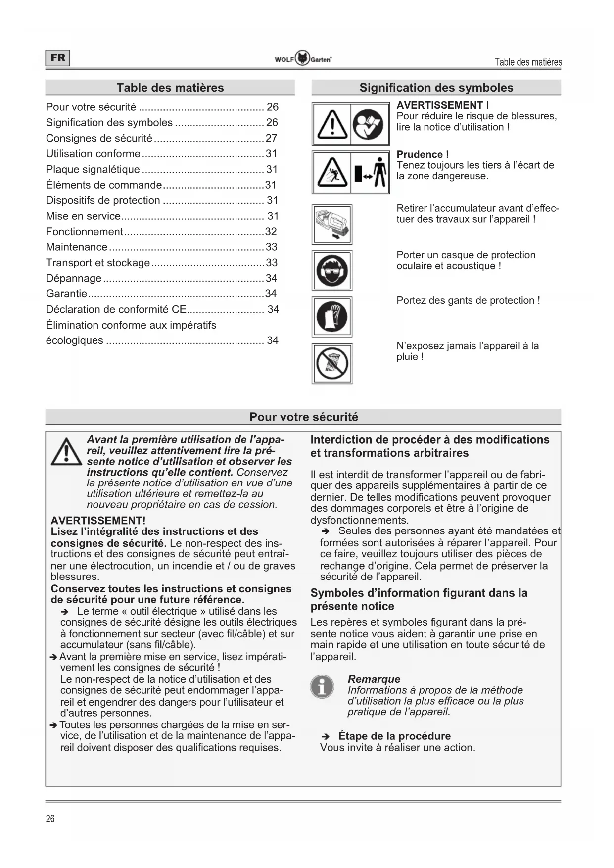 - Élimination conforme aux impératifs écologiques Signication des symboles AVERTISSEMENT ! Pour réduire le risque de blessures, lire la notice d’utilisation ! Prudence ! Tenez toujours les tiers à l’écart de la zone dangereuse. Retirer l’accumulateur avant d’eec- tuer des travaux sur l’appareil ! Porter un casque de protection oculaire et acoustique ! Portez des gants de protection ! N’exposez jamais l’appareil à la pluie ! Pour votre sécuritéPour votre sécurité p. 34