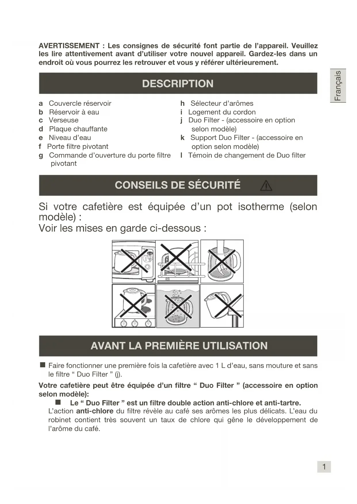 DESCRIPTION Si votre cafetière est équipée d’un pot isotherme (selon modèle) : Voir les mises en garde ci-dessous :