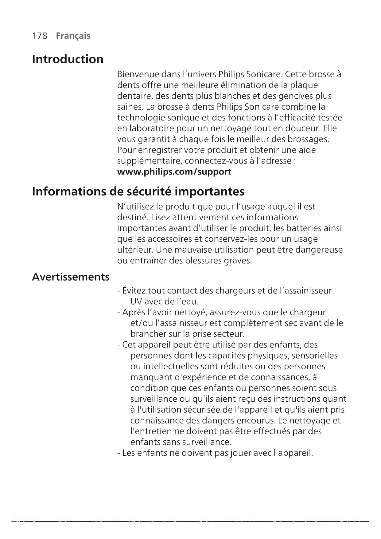 Français Introduction Bienvenue dans l’univers PhilipsSonicare. Cette brosse à dents offre une meilleure élimination de la plaque dentaire, des dents plus blanches et des gencives plus saines. La brosse à dents PhilipsSonicare combine la technologie sonique et des fonctions à l’efficacité testée en laboratoire pour un nettoyage tout en douceur. Elle vous garantit à chaque fois le meilleur des brossages. Pour enregistrer votre produit et obtenir une aide supplémentaire, connectez-vous à l’adresse: www.philips.com/support Informations de sécurité importantes N’utilisez le produit que pour l’usage auquel il est destiné. Lisez attentivement ces informations importantes avant d’utiliser le produit, les batteries ainsi que les accessoires et conservez-les pour un usage ultérieur. Une mauvaise utilisation peut être dangereuse ou entraîner des blessures graves. Avertissements - Évitez tout contact des chargeurs et de l’assainisseur UV avec de l’eau. - Après l’avoir nettoyé, assurez-vous que le chargeur et/ou l’assainisseur est complètement sec avant de le brancher sur la prise secteur. - Cet appareil peut être utilisé par des enfants, des personnes dont les capacités physiques, sensorielles ou intellectuelles sont réduites ou des personnes manquant d'expérience et de connaissances, à condition que ces enfants ou personnes soient sous surveillance ou qu'ils aient reçu des instructions quant à l'utilisation sécurisée de l'appareil et qu'ils aient pris connaissance des dangers encourus. Le nettoyage et l'entretien ne doivent pas être effectués par des enfants sans surveillance. - Les enfants ne doivent pas jouer avec l'appareil.179 Français - Utilisez exclusivement des accessoires ou des consommables Philipsd’origine. Utilisez uniquement le chargeur fourni avec le produit. Utilisez uniquement le câble USB et le bloc d’alimentation USB d’origine (s’ils sont fournis). - Cet appareil ne contient aucune pièce réparable par l’utilisateur. Si l’appareil est endommagé, cessez de l’utiliser et contactez le Service Consommateurs de votre pays. Dispositifs avec cordon uniquement: Si le cordon est endommagé, remplacez le chargeur avec assainisseur par un neuf. - N’utilisez pas le chargeur et/ou l’assainisseur à l’extérieur ou près de surfaces chauffantes. - Ne nettoyez aucune pièce du produit au lave-vaisselle. - Cet appareil a été conçu uniquement pour le brossage des dents, des gencives et de la langue. - Tenez toujours l’assainisseur hors de portée des enfants. - Cessez d’utiliser l’assainisseur si l’ampouleUV reste allumée lorsque le compartiment est ouvert. Les UV peuvent être dangereux pour les yeux et la peau. - Utilisez l’assainisseur uniquement avec l’écran de protection. - Ne touchez pas l’ampouleUV de l’assainisseur UV lorsqu’elle est chaude. - Cessez d’utiliser une tête de brosse dont les brins sont écrasés ou tordus. Remplacez la tête de brosse tous les 3mois ou plus tôt si vous constatez des signes d’usure. - Evitez tout contact direct avec des produits qui contiennent des huiles essentielles ou de l'huile de coprah. Ce contact peut déloger les brins de la brosse à dents. - Cessez d’utiliser l’appareil et consultez votre dentiste/médecin en cas de saignement excessif après utilisation, si le saignement persiste après une semaine d’utilisation ou si vous ressentez une gêne ou une douleur.180 Français - Si vous avez reçu des soins bucco-dentaires, notamment au niveau des gencives, au cours des deux derniers mois, consultez votre dentiste avant d'utiliser cet appareil. - Si vous portez un stimulateur cardiaque ou tout autre dispositif implanté, consultez votre médecin ou le fabricant de votre dispositif avant d’utiliser cet appareil. - Si vous avez des problèmes de santé, consultez votre médecin avant d'utiliser cet appareil. - Cet appareil de soins est personnel et n’est pas destiné à être utilisé sur plusieurs patients dans les cabinets ou établissements dentaires. Consignes de sécurité sur la batterie - Cet appareil contient des piles qui ne peuvent être remplacées que par des personnes qualifiées. - N’utilisez le produit que pour l’usage auquel il est destiné. Lisez attentivement ces renseignements avant d’utiliser le produit, sa batterie et ses accessoires, et conservez-les pour un usage ultérieur. Une mauvaise utilisation peut être dangereuse ou entraîner des blessures graves. Les accessoires fournis peuvent varier selon le produit. - N’utilisez que des accessoires et des consommables Philips d’origine. Utilisez uniquement le bloc d’alimentation amovible TCBxxxx, HX6100, HX6110, HX6160 ou WAAxxxx. - Tenez le produit et les piles à l’abri du feu et ne les exposez pas directement aux rayons du soleil ou à des températures élevées. - Si le produit devient anormalement chaud, dégage une odeur, change de couleur ou si la charge prend plus de temps que d’habitude, cessez d’utiliser et de charger le produit et contactez Philips. - Ne placez pas les produits et leurs piles dans un four à micro-ondes ou sur une table de cuisson à induction.181 Français - Afin d’éviter que les piles ne surchauffent ou ne dégagent des substances toxiques ou dangereuses, le produit et les piles ne doivent pas être ouverts, modifiés, percés, endommagés ou démontés. Les piles ne doivent pas être court-circuitées ou surchargées et leur polarité ne doit pas être inversée. - Cet appareil contient une batterie non remplaçable. Lorsque la batterie est en fin de vie, l’appareil doit être mis au rebut de manière adéquate (voir la section sur le recyclage). - Si les piles sont endommagées ou fuient, évitez tout contact avec les yeux ou la peau. Si cela se produit, laver immédiatement et abondamment avec de l'eau et consulter un médecin. - Lorsque vous manipulez une batterie, veillez à bien sécher vos mains, le produit et la ba