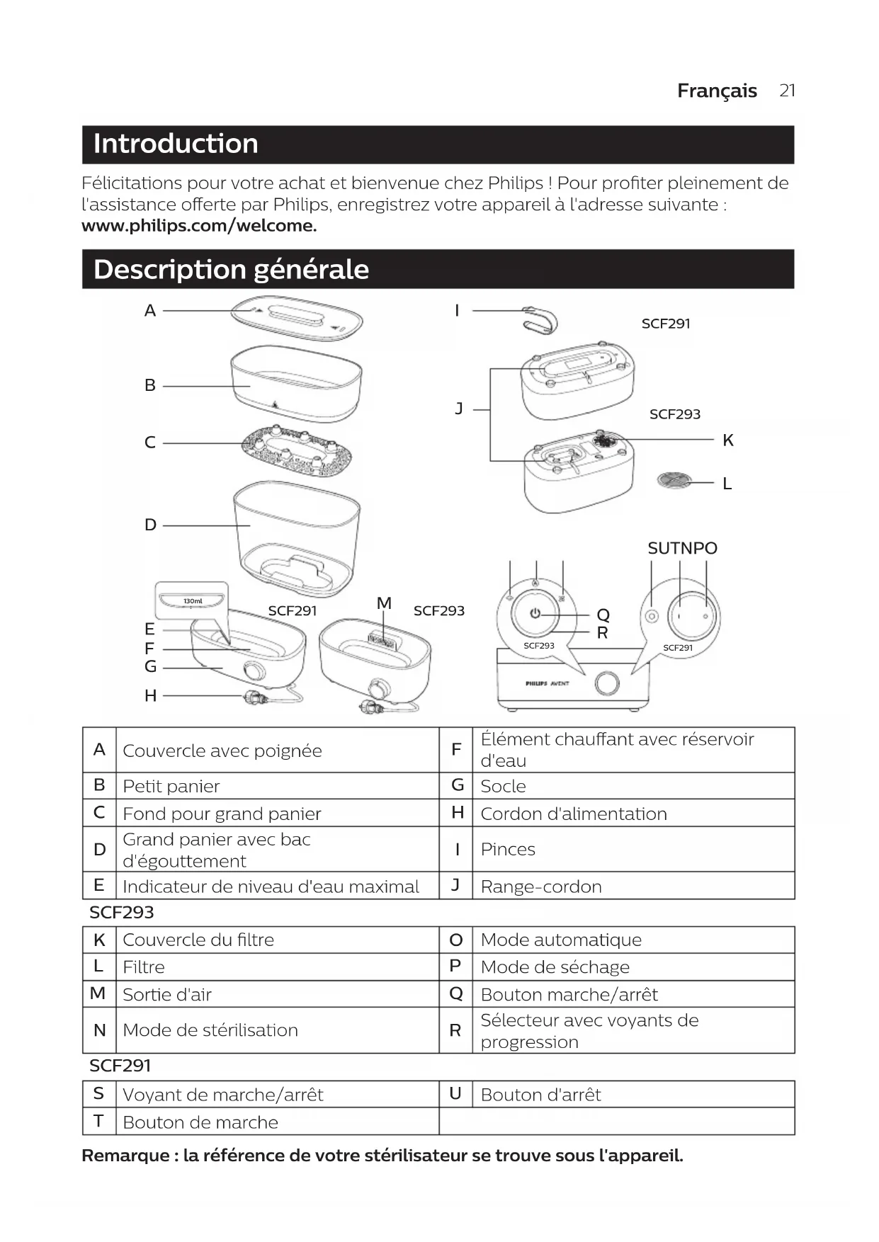 Français- L’appareil devient très chaud en cours de fonctionnement et peut provoquer des brûlures en cas de contact. - Prenez garde à la vapeur brûlante qui s'échappe de l'orice du couvercle ou au moment où vous retirez ce dernier. Elle peut provoquer des brûlures. - Ne touchez pas le socle, les paniers et le couvercle pendant ou juste après le fonctionnement car ils sont brûlants. Utilisez toujours la poignée pour soulever le couvercle. - Ne déplacez et n'ouvrez jamais l'appareil en cours d'utilisation ou lorsque l'eau est encore chaude. - Ne posez jamais d'objets sur l'appareil en cours de fonctionnement. - Utilisez uniquement de l'eau sans additifs. - Ne versez pas d'eau de Javel ni d'autres produits chimiques dans l'appareil. - Ne versez pas d'eau plus haut que l'indication sur le réservoir, soit 130 ml (4.5 oz) d'eau. - Stérilisez uniquement des biberons et objets qui peuvent être stérilisés à la vapeur. Reportez-vous au mode d'emploi des objets que vous souhaitez stériliser pour vous assurer qu'ils peuvent passer au stérilisateur. - Si vous souhaitez arrêter l'opération, appuyez sur le bouton d'arrêt (pour SCF291) ou appuyez sur le bouton de marche/ arrêt (pour SCF293) pour éteindre l'appareil. - Cet appareil est destiné à un usage domestique uniquement. - Pour éviter tout risque de blessure, n'utilisez pas le stérilisateur à d'autres ns que celles pour lesquelles il a été conçu. Attention - N'utilisez jamais d'accessoires ou de pièces d'un autre fabricant ou n'ayant pas été spéciquement recommandés par Philips. L'utilisation de ce type d'accessoires ou de pièces entraîne l'annulation de la garantie.