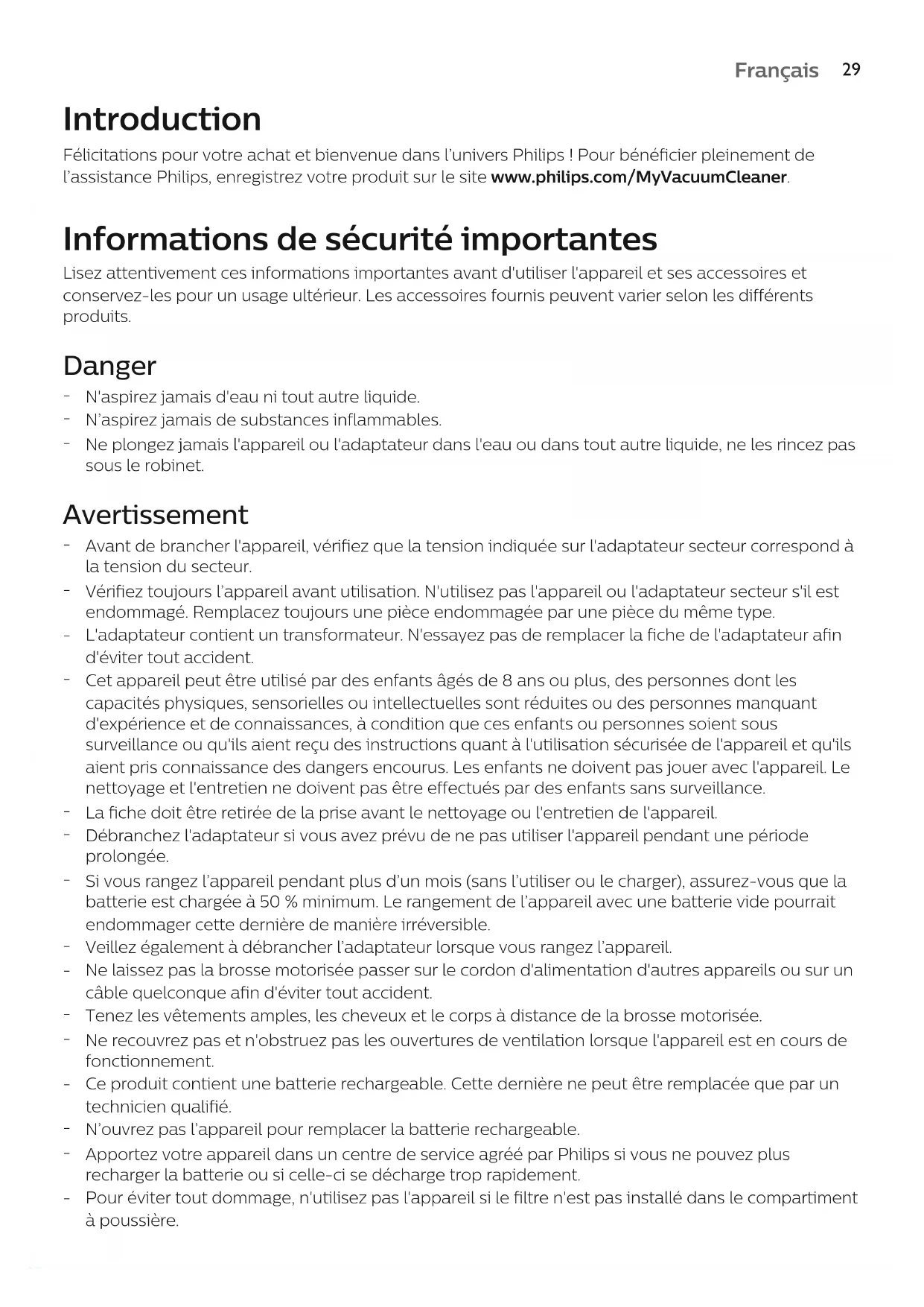 Français Introduction Félicitations pour votre achat et bienvenue dans l’univers Philips! Pour bénéficier pleinement de l’assistance Philips, enregistrez votre produit sur le site www.philips.com/MyVacuumCleaner. Informations de sécurité importantes Lisez attentivement ces informations importantes avant d'utiliser l'appareil et ses accessoires et conservez-les pour un usage ultérieur. Les accessoires fournis peuvent varier selon les différents produits. Danger