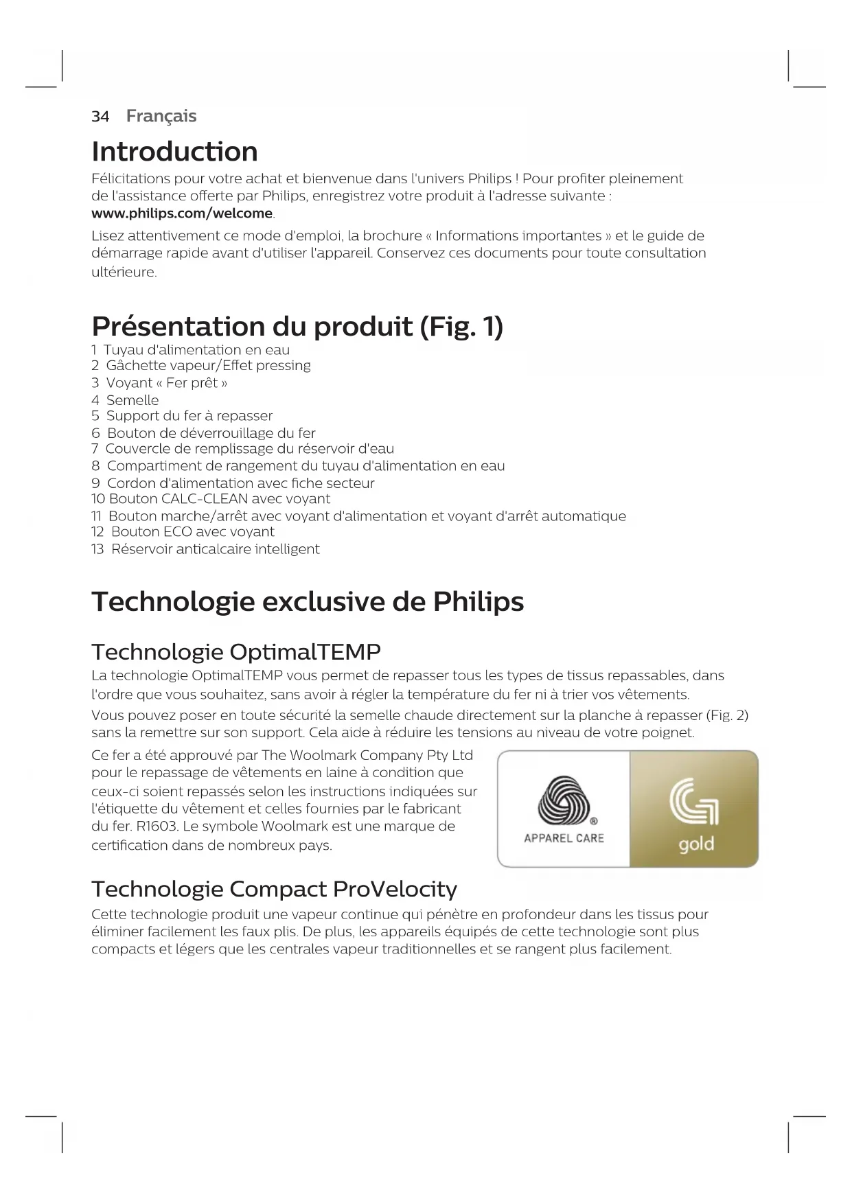 d'un vêtement directement sur la personne qui le porte (Fig. 12). Ne projetez pas de vapeur près de vos mains ou de celles de quelqu'un d'autre. Vous pouvez utiliser le fer vapeur en position verticale an d'enlever les plis des vêtements sur cintre. 1 Maintenez le fer en position verticale, appuyez sur le bouton vapeur, puis eeurez le vêtement avec la semelle en déplaçant le fer vers le haut et vers le bas (Fig. 13). Repos en sécurité Posez le fer lorsque vous manipulez un vêtement. Lorsque vous manipulez un vêtement, vous pouvez poser le fer sur son support ou horizontalement sur la planche à repasser (Fig. 2). La technologie OptimalTEMP garantit que la semelle n'endommagera pas la housse de la planche à repasser. Économie d'énergie Eco mode (Mode éco.) En utilisant le mode ECO (quantité réduite de vapeur), vous pouvez économiser l'énergie sans compromettre le résultat de repassage. 1 Pour activer le mode ECO, appuyez sur le bouton ECO (Fig. 14). Le voyant vert ECO s'allume. 2 Pour désactiver le mode ECO, appuyez à nouveau sur le bouton ECO. Le voyant vert ECO s'éteint. Français37 Mode d'arrêt automatique de sécurité (certains modèles uniquement) - Dans un souci d'économie d'énergie, l'appareil s'éteint automatiquement s'il n'a pas été utilisé depuis 5 minutes. Le voyant d'arrêt automatique du bouton marche/arrêt se met à clignoter. - Pour réactiver l'appareil, appuyez sur le bouton marche/arrêt. L'appareil recommence alors à chauer.