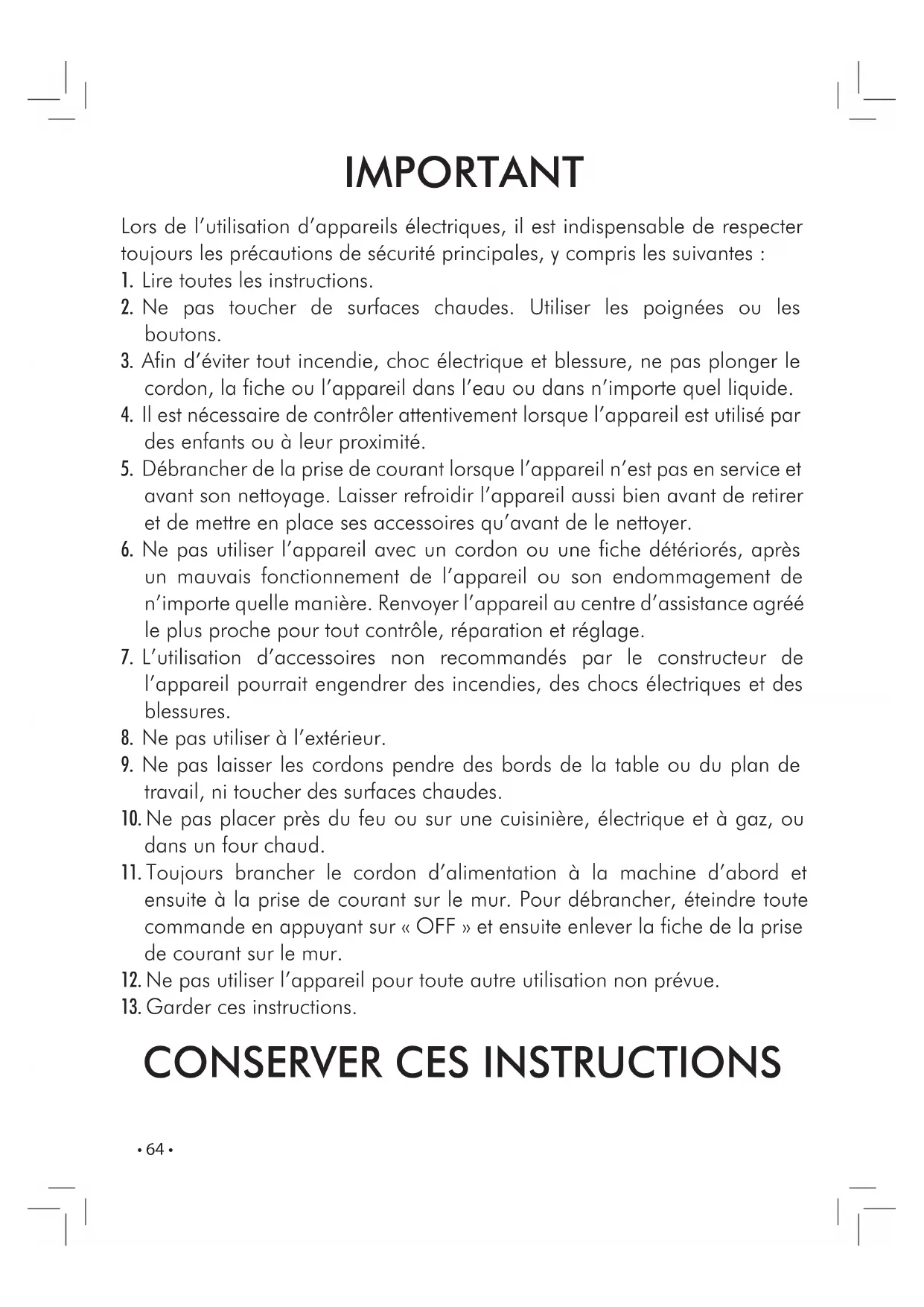JAHR 09 2006/95/EG, 2004/108/EG, R & D Manager H. Andrea CastellaniRobecco sul Naviglioli, 28/04/2009• 64 • IMPORTANT Lors de l’utilisation d’appareils électriques, il est indispensable de respecter toujours les précautions de sécurité principales, y compris les suivantes :