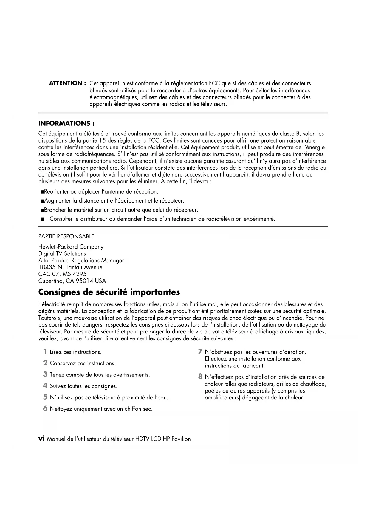 wvi Manuel de l’utilisateur du téléviseur HDTV LCD HP Pavilion ATTENTION : Cet appareil n’est conforme à la réglementation FCC que si des câbles et des connecteurs blindés sont utilisés pour le raccorder à d’autres équipements. Pour éviter les interférences électromagnétiques, utilisez des câbles et des connecteurs blindés pour le connecter à des appareils électriques comme les radios et les téléviseurs. INFORMATIONS : Cet équipement a été testé et trouvé conforme aux limites concernant les appareils numériques de classe B, selon les dispositions de la partie 15 des règles de la FCC. Ces limites sont conçues pour offrir une protection raisonnable contre les interférences dans une installation résidentielle. Cet équipement produit, utilise et peut émettre de l’énergie sous forme de radiofréquences. S’il n’est pas utilisé conformément aux instructions, il peut produire des interférences nuisibles aux communications radio. Cependant, il n’existe aucune garantie assurant qu’il n’y aura pas d’interférence dans une installation particulière. Si l’utilisateur constate des interférences lors de la réception d’émissions de radio ou de télévision (il suffit pour le vérifier d’allumer et d’éteindre successivement l’appareil), il devra prendre l’une ou plusieurs des mesures suivantes pour les éliminer. À cette fin, il devra : ■ Réorienter ou déplacer l’antenne de réception. ■ Augmenter la distance entre l’équipement et le récepteur. ■ Brancher le matériel sur un circuit autre que celui du récepteur. ■ Consulter le distributeur ou demander l’aide d’un technicien de radiotélévision expérimenté. PARTIE RESPONSABLE : Hewlett-Packard Company Digital TV Solutions Attn: Product Regulations Manager 10435 N. Tantau Avenue CAC 07, MS 4295 Cupertino, CA 95014 USA Consignes de sécurité importantes L’électricité remplit de nombreuses fonctions utiles, mais si on l’utilise mal, elle peut occasionner des blessures et des dégâts matériels. La conception et la fabrication de ce produit ont été prioritairement axées sur une sécurité optimale. Toutefois, une mauvaise utilisation de l’appareil peut entraîner des risques de choc électrique ou d’incendie. Pour ne pas courir de tels dangers, respectez les consignes ci-dessous lors de l’installation, de l’utilisation ou du nettoyage du téléviseur. Par mesure de sécurité et pour prolonger la durée de vie de votre téléviseur à affichage à cristaux liquides, veuillez, avant de l’utiliser, lire attentivement les consignes de sécurité suivantes : 1 Lisez ces instructions. 2 Conservez ces instructions. 3 Tenez compte de tous les avertissements. 4 Suivez toutes les consignes. 5 N’utilisez pas ce téléviseur à proximité de l’eau. 6 Nettoyez uniquement avec un chiffon sec. 7 N’obstruez pas les ouvertures d’aération. Effectuez une installation conforme aux instructions du fabricant. 8 N’effectuez pas d’installation près de sources de chaleur telles que radiateurs, grilles de chauffage, poêles ou autres appareils (y compris les amplificateurs) dégageant de la chaleur.vii
