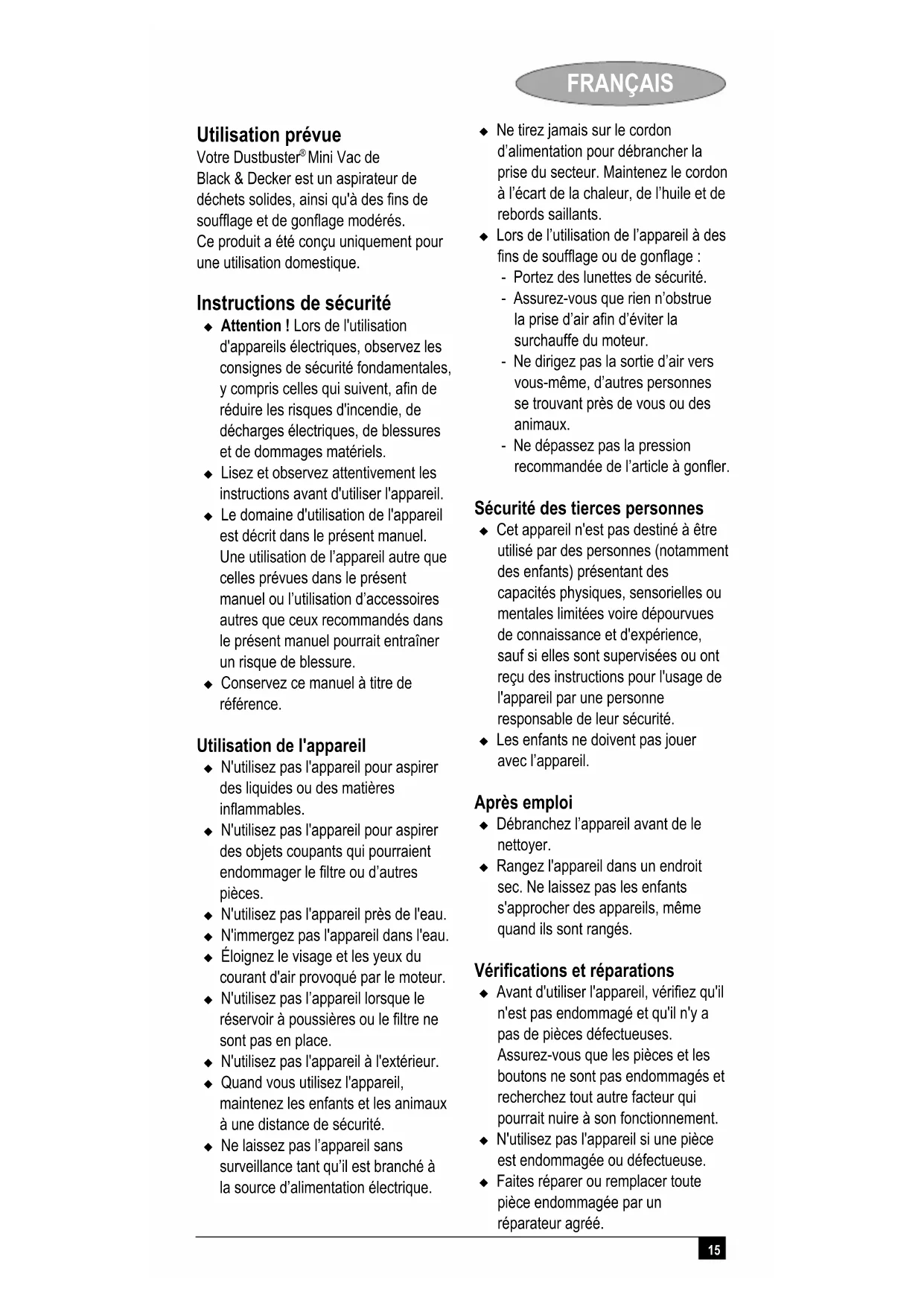 Mini Vac de Black & Decker est un aspirateur de déchets solides, ainsi qu'à des fins de soufflage et de gonflage modérés. Ce produit a été conçu uniquement pour une utilisation domestique. Instructions de sécurité Attention ! Lors de l'utilisation d'appareils électriques, observez les consignes de sécurité fondamentales, y compris celles qui suivent, afin de réduire les risques d'incendie, de décharges électriques, de blessures et de dommages matériels. Lisez et observez attentivement les instructions avant d'utiliser l'appareil. Le domaine d'utilisation de l'appareil est décrit dans le présent manuel. Une utilisation de l’appareil autre que celles prévues dans le présent manuel ou l’utilisation d’accessoires autres que ceux recommandés dans le présent manuel pourrait entraîner un risque de blessure. Conservez ce manuel à titre de référence. Utilisation de l'appareil N'utilisez pas l'appareil pour aspirer des liquides ou des matières inflammables. N'utilisez pas l'appareil pour aspirer des objets coupants qui pourraient endommager le filtre ou d’autres pièces. N'utilisez pas l'appareil près de l'eau. N'immergez pas l'appareil dans l'eau. Éloignez le visage et les yeux du courant d'air provoqué par le moteur. N'utilisez pas l’appareil lorsque le réservoir à poussières ou le filtre ne sont pas en place. N'utilisez pas l'appareil à l'extérieur. Quand vous utilisez l'appareil, maintenez les enfants et les animaux à une distance de sécurité. Ne laissez pas l’appareil sans surveillance tant qu’il est branché à la source d’alimentation électrique. Ne tirez jamais sur le cordon d’alimentation pour débrancher la prise du secteur. Maintenez le cordon à l’écart de la chaleur, de l’huile et de rebords saillants. Lors de l’utilisation de l’appareil à des fins de soufflage ou de gonflage : - Portez des lunettes de sécurité. - Assurez-vous que rien n’obstrue la prise d’air afin d’éviter la surchauffe du moteur. - Ne dirigez pas la sortie d’air vers vous-même, d’autres personnes se trouvant près de vous ou des animaux. - Ne dépassez pas la pression recommandée de l’article à gonfler. Sécurité des tierces personnes Cet appareil n'est pas destiné à être utilisé par des personnes (notamment des enfants) présentant des capacités physiques, sensorielles ou mentales limitées voire dépourvues de connaissance et d'expérience, sauf si elles sont supervisées ou ont reçu des instructions pour l'usage de l'appareil par une personne responsable de leur sécurité. Les enfants ne doivent pas jouer avec l’appareil. Après emploi Débranchez l’appareil avant de le nettoyer. Rangez l'appareil dans un endroit sec. Ne laissez pas les enfants s'approcher des appareils, même quand ils sont rangés. Vérifications et réparations Avant d'utiliser l'appareil, vérifiez qu'il n'est pas endommagé et qu'il n'y a pas de pièces défectueuses. Assurez-vous que les pièces et les boutons ne sont pas endommagés et recherchez tout autre facteur qui pourrait nuire à son fonctionnement. N'utilisez pas l'appareil si une pièce est endommagée ou défectueuse. Faites réparer ou remplacer toute pièce endommagée par un réparateur agréé.16 FRANÇAIS Vérifiez régulièrement le câble d’alimentation électrique pour vous assurer qu'il n'est pas endommagé. Si le câble d'alimentation est endommagé, il doit être remplacé par le fabricant ou par un centre de réparation agréé Black & Decker afin d’éviter tout accident. N'essayez jamais d'enlever ou de changer des pièces autres que celles spécifiées dans ce manuel. Sécurité électrique