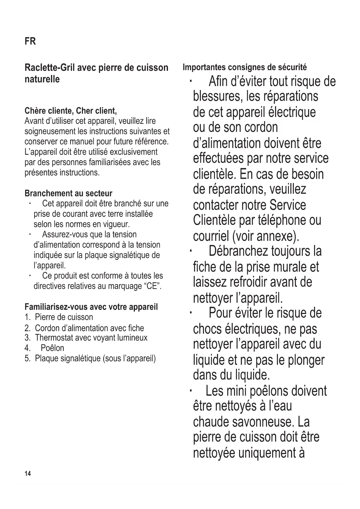 l’eau courante. Pour des informations détaillées concernant le nettoyage de l’appareil, veuillez vous référer au paragraphe Entretien et nettoyage. ∙ L’appareil n’est pas destiné à être utilisé avec un programmateur externe ou une télécommande indépendante. ∙ Cet appareil est destiné à être utilisé dans des applications domestiques et analogues telles que : - des coins cuisines réservés au personnel dans des magasins, bureaux et autres environnements professionnels ; - des fermes ; - l’utilisation par les clients des hôtels, motels et autres environnements à caractère résidentiel ; - des environnements de type chambres d’hôtes. ∙ Cet appareil peut être utilisé par des enfants (à partir de 8 ans) et par des personnes souffrant de déciences physiques, sensorielles ou mentales, ou manquant d’expérience ou de connaissances, s’ils ont été formés à l’utilisation de l’appareil et ont été supervisés, et s’ils en comprennent les dangers et les précautions de sécurité à prendre. ∙ Les enfants ne sont pas autorisés à jouer avec l’appareil. ∙ Les enfants ne doivent pas être autorisés à nettoyer ou entretenir l’appareil à moins d’être supervisés et d’avoir plus de 8 ans. ∙ L’appareil et son cordon d’alimentation doivent être,16 104 x 142 mm à tout moment, tenus hors de portée des enfants de moins de 8 ans. ∙ Attention : Tenez les enfants à l’écart des emballages, qui représentent un risque potentiel, par exemple, de suffocation. ∙ Avant toute utilisation, vériez soigneusement que l’appareil, son cordon d’alimentation et ses accessoires ne présentent aucun signe de détérioration qui pourrait avoir un effet néfaste sur la sécurité de fonctionnement de l’appareil. Au cas où l’appareil, par exemple, serait tombé sur une surface dure, ou si une force excessive aurait été employée pour tirer sur le cordon d’alimentation, il ne doit plus être utilisé. ∙ Les surfaces de l’appareil, la pierre de cuisson et les poêlons chauffent pendant le fonctionnement et le restent quelque temps après. Attention : Risque de brûlure. ∙ Ne jamais faire fonctionner l’appareil sans surveillance. ∙ Le cordon doit toujours être tenu à l’écart des surfaces chaudes de l’appareil. ∙ Placez l’appareil sur une surface stable, plane, horizontale et résistante à la chaleur et aux éclaboussures d’eau ou de graisse. ∙ Prenez soin de ne pas placer l’appareil contre un mur ou dans un angle, et de le tenir à l’écart de toute matière inammable. ∙ Ne le posez l’appareil sur une surface chaude, comme une cuisinière, ou près d’une amme. ∙ Attention : N’utilisez pas l’appareil à l’extérieur. ∙ Avant utilisation, la pierre de cuisson doit être installée sur l’appareil, au- dessus de la résistance. ∙ Débranchez toujours la che de la prise murale - après utilisation, - en cas de fonctionnement défectueux, - avant de nettoyer l’appareil. ∙ Ne pas débrancher l’appareil en tirant sur le cordon ; tirez toujours sur la che. ∙ Nous déclinons toute responsabilité pour les dommages éventuels subis par cet appareil, résultant d’une utilisation incorrecte ou du non-respect de ce mode d’emploi. Utilisations Cet appareil est un appareil à raclette électrique, qui convient pour la cuisson avec peu de matière grasse de la viande, du poisson et légumes et du fromage gratiné. L’usage de tout aliment autre que ceux donnés dans ce mode d’emploi doit être considéré comme inadéquat et peut occasionner des blessures corporelles ou des dommages matériels.104 x 142 mm