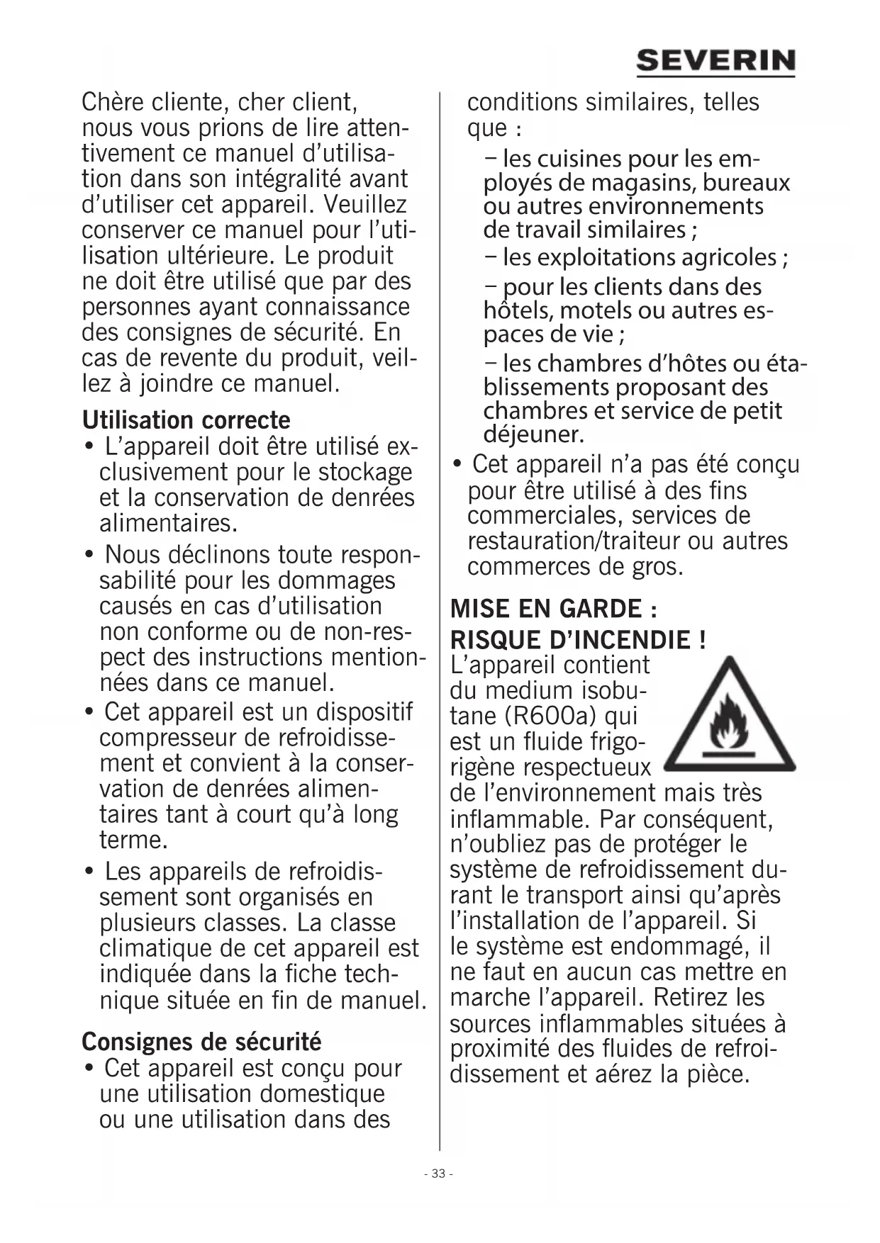 - Cet appareil n’a pas été conçu pourêtreutiliséàdesns commerciales, services de restauration/traiteur ou autres commerces de gros. MISE EN GARDE : RISQUE D’INCENDIE ! L’appareil contient du medium isobu- tane (R600a) qui estunuidefrigo- rigène respectueux de l’environnement mais très inammable.Parconséquent, n’oubliez pas de protéger le système de refroidissement du- rant le transport ainsi qu’après l’installation de l’appareil. Si le système est endommagé, il ne faut en aucun cas mettre en marche l’appareil. Retirez les sourcesinammablessituéesà proximitédesuidesderefroi- dissement et aérez la pièce.- 34 -
