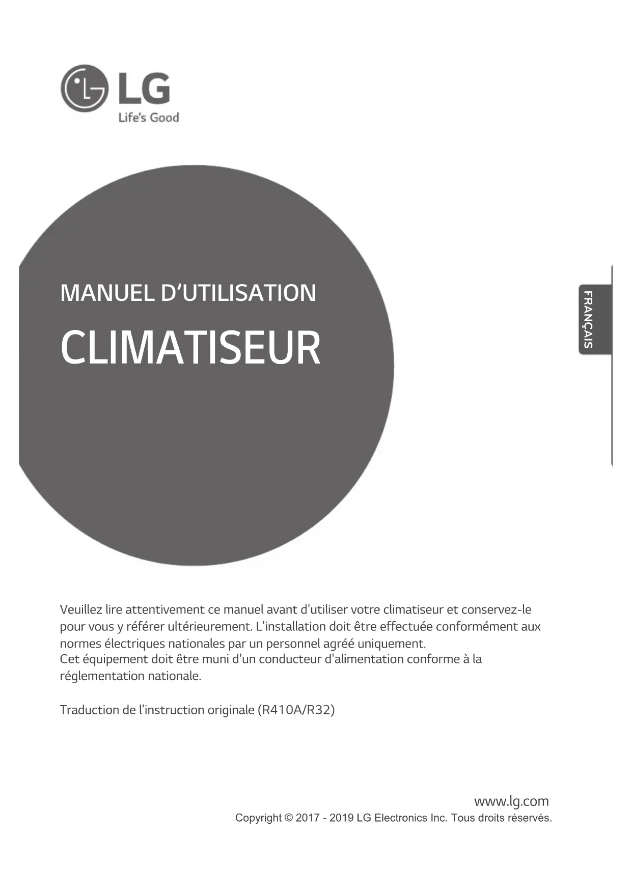 Veuillez lire attentivement ce manuel avant d'utiliser votre climatiseur et conservez-le pour vous y référer ultérieurement. L'installation doit être effectuée conformément aux normes électriques nationales par un personnel agréé uniquement. Cet équipement doit être muni d'un conducteur d'alimentation conforme à la réglementation nationale. Traduction de l’instruction originale (R410A/R32) CLIMATISEUR Copyright © 2017 - 2019 LG Electronics Inc. Tous droits réservés. FRANÇAISTable des matières 2 Unité Interieure