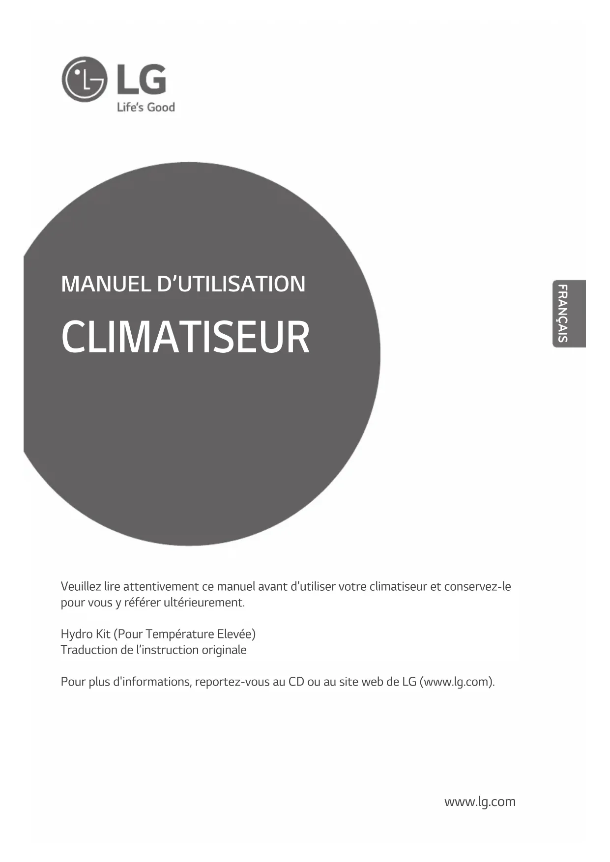 Veuillez lire attentivement ce manuel avant d'utiliser votre climatiseur et conservez-le pour vous y référer ultérieurement. Hydro Kit (Pour Température Elevée) Traduction de l’instruction originale Pour plus d'informations, reportez-vous au CD ou au site web de LG (www.lg.com). CLIMATISEUR FRANÇAIS2 Hydro Kit Manuel de l’utilisateur Hydro Kit