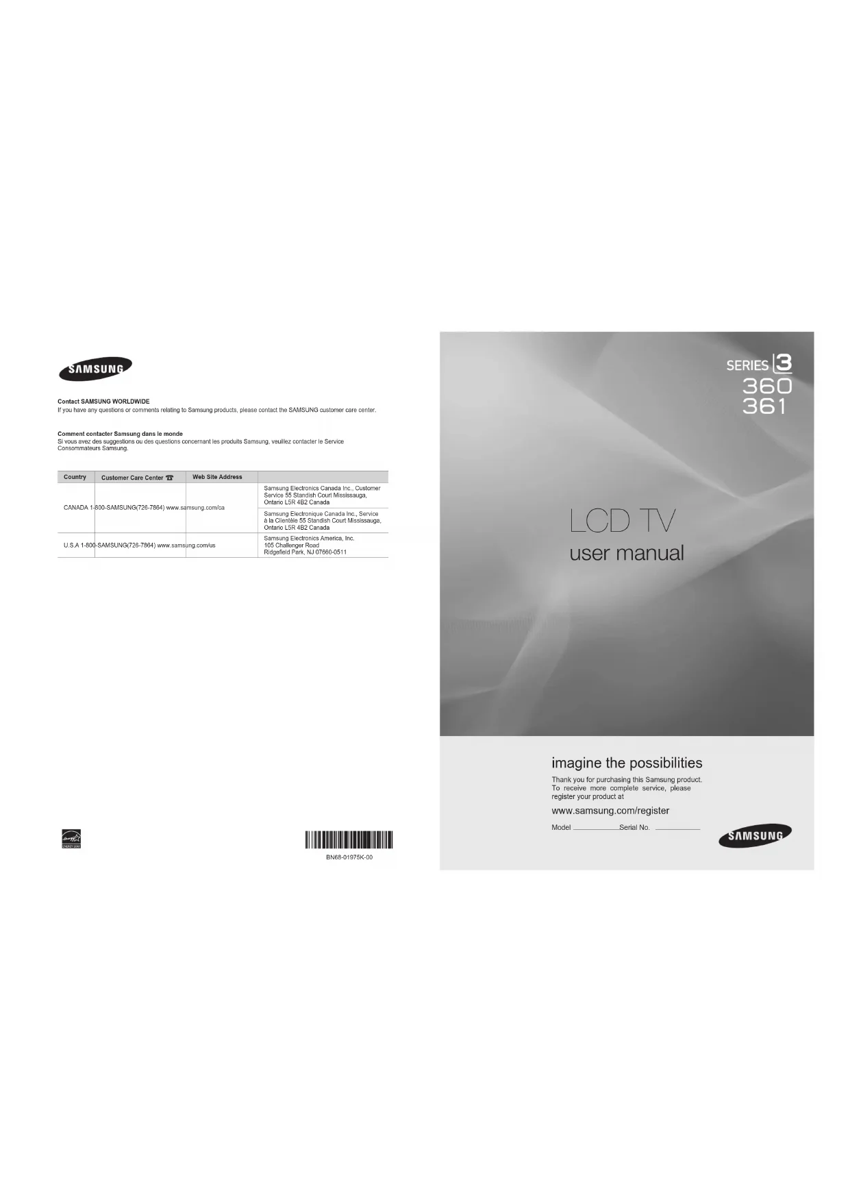 BN68-01975K-00L02.indb 44 2009-02-20 12:36:12This page is intentionally left blank. BN68-01975K-00L02.indb 45 2009-02-20 12:36:12TÉLÉVISEUR ACL Guide de l’utilisateur Imaginez les possibilités Merci d’avoir acheté un produit Samsung. Pour obtenir un service complet, veuillez enregistrer votre produit à: www.samsung.com/register Modèle N° de série
