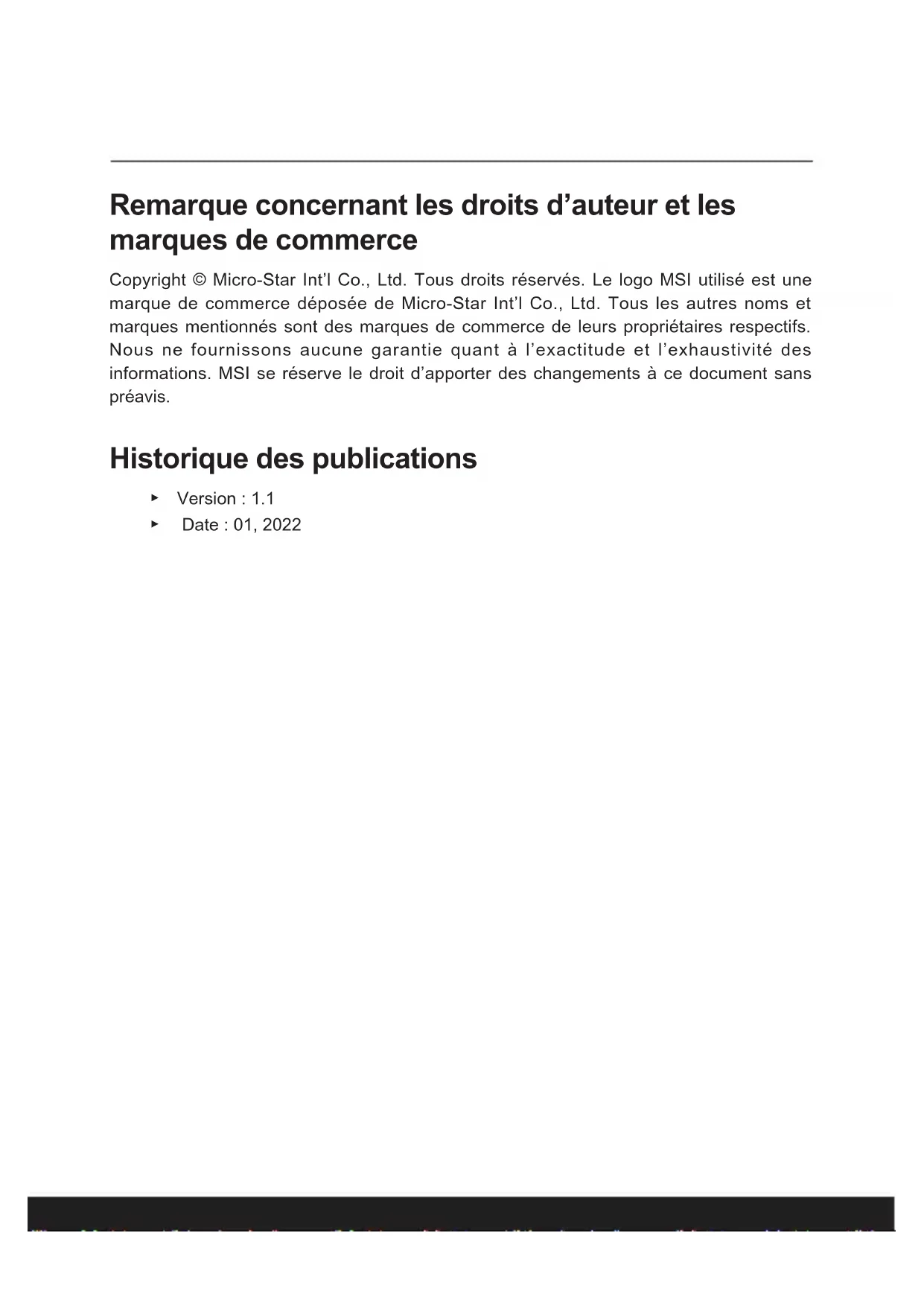 - -26 Vidéo : Comment utiliser MSI One Touch Install -271-4 1-5 Remarque concernant les droits d’auteur et les marques de commerce Copyright © Micro-Star Int’l Co., Ltd. Tous droits réservés. Le logo MSI utilisé est une marque de commerce déposée de Micro-Star Int’l Co., Ltd. Tous les autres noms et marques mentionnés sont des marques de commerce de leurs propriétaires respectifs. Nous ne fournissons aucune garantie quant à l’exactitude et l’exhaustivité des informations. MSI se réserve le droit d’apporter des changements à ce document sans préavis. Historique des publications ▶ Version : 1.1 ▶ Date : 01, 20221-6 1-7 Déclaration FCC-B sur les interférences de radiofréquence Cet appareil a subi des tests de contrôle et a été déclaré conforme aux restrictions imposées aux appareils numériques de classe B, par la section 15 de la réglementation FCC. Ces restrictions sont destinées à assurer une protection raisonnable contre les interférences indésirables lorsque l’appareil est utilisé dans un environnement résidentiel. Ce matériel génère, exploite et peut émettre des fréquences radioélectriques. En outre, en cas d’installation ou d’utilisation non conforme aux instructions, il risque de provoquer des interférences indésirables avec les communications radioélectriques. Cependant, rien ne garantit qu’aucune interférence ne se produise dans certaines installations particulières. Si cet équipement provoque des interférences indésirables avec les réceptions radio et TV (ce que vous pouvez déterminer en allumant et en éteignant l’appareil), nous vous engageons vivement à y remédier en prenant l’une des mesures suivantes : ▶ Réorientez ou déplacez l’antenne de réception. ▶ Augmentez la distance séparant l’appareil du récepteur. ▶ Raccordez l’appareil à une prise de courant située sur un circuit différent de celui du récepteur. REMARQUES ▶ Les changements ou modifications qui ne sont pas expressément approuvés par la partie responsable de la conformité aux normes peuvent annuler le droit de l’utilisateur à utiliser l’appareil. ▶ Les câbles blindés et les cordons d’alimentation CA, s’il y en a, doivent être utilisés de manière à être conformes aux limitations sur les émissions. Conditions FCC Cet appareil est conforme aux dispositions de la section 15 de la réglementation FCC. Son utilisation est soumise aux deux conditions suivantes : ▶ Cet appareil ne doit pas générer d'interférences nuisibles. ▶ Cet appareil doit accepter toute interférence reçue, même celles qui sont susceptibles d'entraîner un fonctionnement indésirable.1-6 1-7 Conformité CE Ce périphérique est conforme aux exigences essentielles de sécurité et aux autres dispositions relatives mises en place par les Directives Européennes. Réglementations de batterie Union européenne : Les piles, les batteries et les accumulateurs ne doivent pas être jetés comme des déchets domestiques non triés. Veuillez faire appel au système de collecte public pour faire recycler ou détruire votre batterie en conformité avec les réglementations locales. p. 3