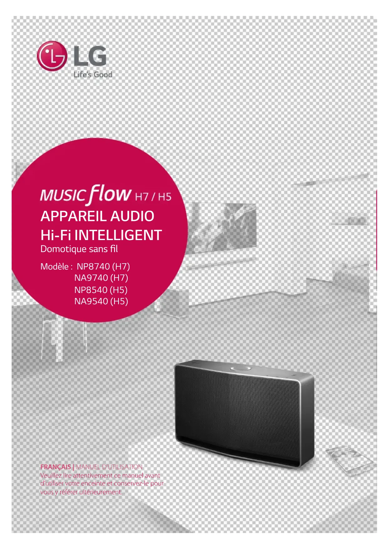 Table des matières 1 Démarrage 2 Consignes de sécurité 7 Principales fonctionnalités 7 Accessoires 7 Introduction 8 Panneau supérieur 9 Panneau arrière 2 Raccordements 10 Raccordement de l’adaptateur 11 Configuration multi-pièces initiale 11 – Connexion câblée (connexion au réseau maillé MUSICflow) 11 – Connexion sans fil (standard) 12 Installation de l'application « Music Flow Player » 13 – Prise en main de l'application Music Flow Player 14 – Connexion simple (paramétrage facile) 15 Utilisation de Media Server pour PC 15 – Logiciel PC Music Flow pour Windows 16 – Nero MediaHome 4 Essentials pour MAC OS 17 Raccordement de l'enceinte à votre réseau domestique 17 – Raccordement de l'enceinte à votre réseau avec un câble de réseau local 20 – Connexion de l'enceinte à votre réseau via la méthode de configuration Wi-Fi (Android) 23 – Connexion de l'enceinte à votre réseau via la méthode de configuration Wi-Fi (iOS) 27 Raccordement d'enceintes supplémentaires à votre réseau domestique 27 – Raccordement d'une enceinte supplémentaire à votre réseau avec un câble de réseau local 29 – Raccordement d'une enceinte supplémentaire à votre réseau via la méthode de configuration Wi-Fi (Android) 31 Utilisation du routeur 31 – Utilisation comme un périphérique racine (relié par câble au routeur domestique) 33 – Utilisation comme une extension sans fil 3 Utilisation 35 Fonctions de base 35 – Utilisation de la touche 1/!/F 35 – Utilisation du bouton de volume 36 Écoute de la musique avec l'application Music Flow Player 36 – Présentation du menu Accueil 37 – Présentation du menu latéral 38 – Lecture d'une chanson 39 – Présentation de la lecture 41 – Lecture groupée 42 – Lecture en continu 44 Utilisation de LG HomeChat 44 – À propos de LG HomeChat 44 – Démarrage de LG HomeChat 46 – Exemples d'utilisation 47 Configuration du haut-parleur avec l'application Music Flow Player 47 – Présentation du menu des réglages 48 – Menu [Général] 48 – Menu [Enceintes] 49 – Menu [Alarme/Minuterie d'arrêt] 49 – Menu [Bibliothèque musicale] 49 – Menu [Gestion du compte] 49 – Menu [Fuseau horaire] 50 – Menu [Paramètres avancés] 52 – Menu [Google Cast] 52 – Menu [Informations sur la version] 52 – Menu [Licences open source] 53 Utilisation de la technologie sans fil Bluetooth 53 – À propos de la technologie Bluetooth 53 – Profils BluetoothTable des matières6 53 – Écoute de la musique d'un périphérique Bluetooth 54 – Connexion NFC pour un jumelage facile (Android uniquement) 55 Écoute de la musique depuis un périphérique externe 55 Mode veille 55 – Mode veille 55 – Mode veille avec maintien de la connexion au réseau 56 Réinitialisation de l'enceinte 56 – Réinitialisation de l’enceinte 56 – Réinitialisation du Music Flow R1 4 Dépannage 57 Dépannage 57 – Généralités 58 – Réseau 59 – Application et logiciel PC 5 Annexe 60 Impératifs à respecter pour les fichiers 60 Marques de commerce et licences 61 À propos de la condition du voyant d’état 62 Spécifications 63 Manipulation de l'enceinte 63 Informations importantes concernant les services réseau 64 CONDITIONS D'UTILISATION Certains éléments de l'application Music Flow Player mentionnés dans le présent manuel peuvent varier en fonction de la version de l'application.Démarrage 7 Démarrage