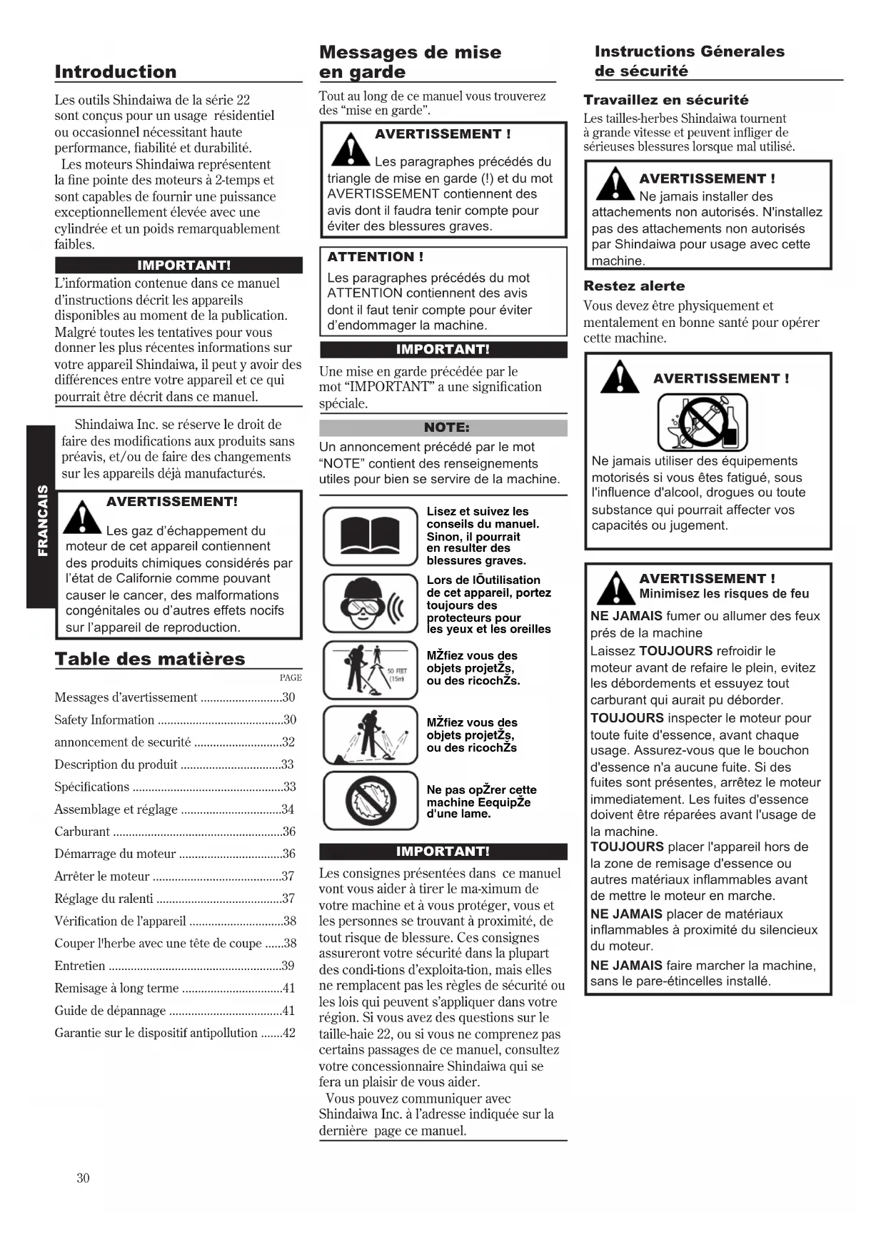 - Tout au long de ce manuel vous trouverez des “mise en garde”. IMPORTANT! Les consignes présentées dans ce manuel vont vous aider à tirer le ma-ximum de votre machine et à vous protéger, vous et les personnes se trouvant à proximité, de tout risque de blessure. Ces consignes assureront votre sécurité dans la plupart des condi-tions d’exploita-tion, mais elles ne remplacent pas les règles de sécurité ou les lois qui peuvent s’appliquer dans votre région. Si vous avez des questions sur le taille-haie 22, ou si vous ne comprenez pas certains passages de ce manuel, consultez votre concessionnaire Shindaiwa qui se fera un plaisir de vous aider. Vous pouvez communiquer avec Shindaiwa Inc. à l’adresse indiquée sur la dernière page ce manuel. Messages de mise en garde Introduction PAGE Les outils Shindaiwa de la série 22 sont conçus pour un usage résidentiel ou occasionnel nécessitant haute performance, fiabilité et durabilité. Les moteurs Shindaiwa représentent la fine pointe des moteurs à 2-temps et sont capables de fournir une puissance exceptionnellement élevée avec une cylindrée et un poids remarquablement faibles. Messages d’avertissement p. 30