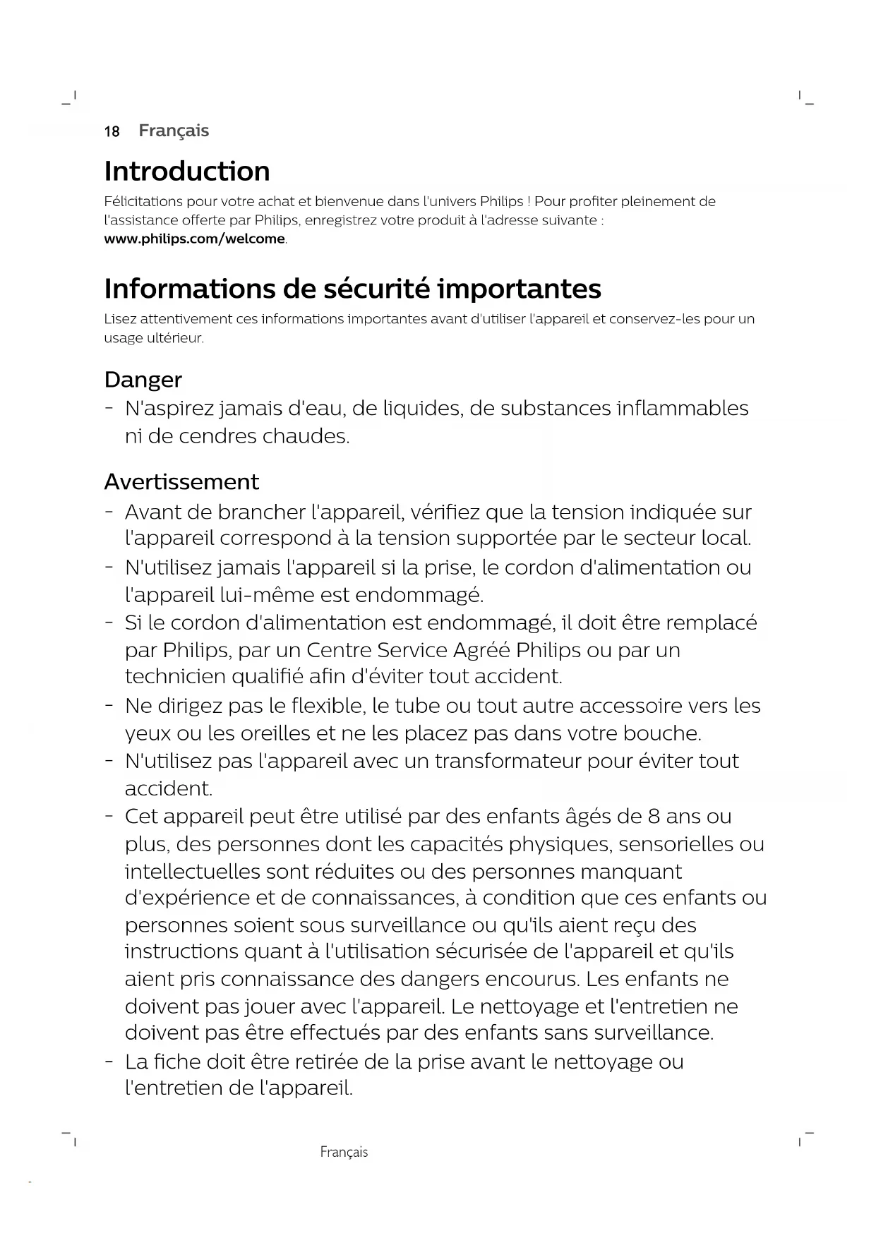 EspañolFrançais Introduction Félicitations pour votre achat et bienvenue dans l'univers Philips! Pour profiter pleinement de l'assistance offerte par Philips, enregistrez votre produit à l'adresse suivante:www.philips.com/welcome. Informations de sécurité importantes Lisez attentivement ces informations importantes avant d'utiliser l'appareil et conservez-les pour unusage ultérieur. Danger