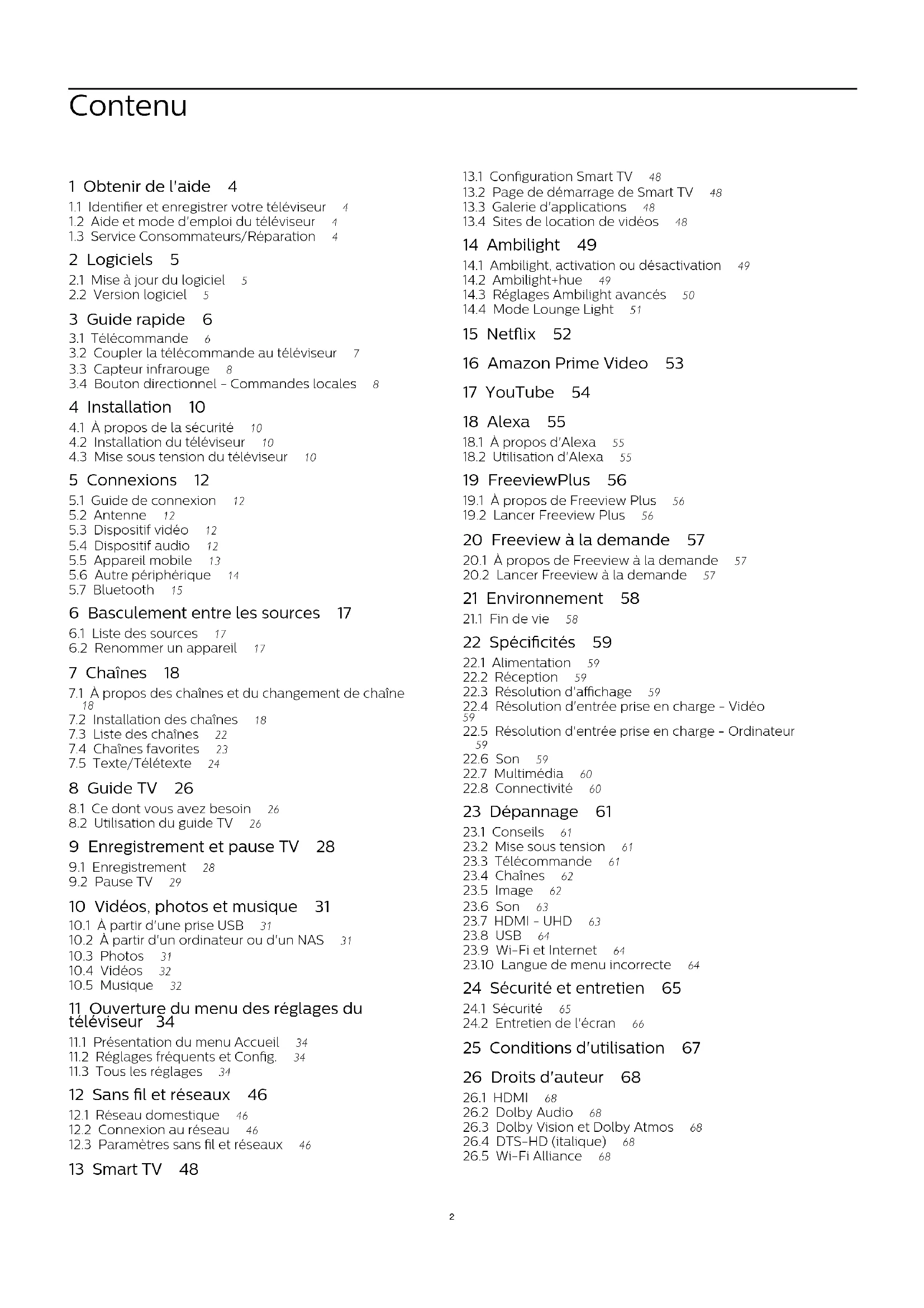 Accès universel 43 Accès universel, description audio 43 Accès universel, dialogue 43 Accès universel, effets audio 43 Accès universel, malentendants 43 Accès universel, volume mixte 43 Adresse IP fixe 46 Afficher les paramètres réseau 46 Alexa 55 Allumer via Wi-Fi 46 Amélioration des dialogues 43 Ambilight 49 Ambilight+hue 49 Ambilight+hue, ampoules Hue 49 Ambilight, activation ou désactivation 49 Application Philips TV Remote 14
