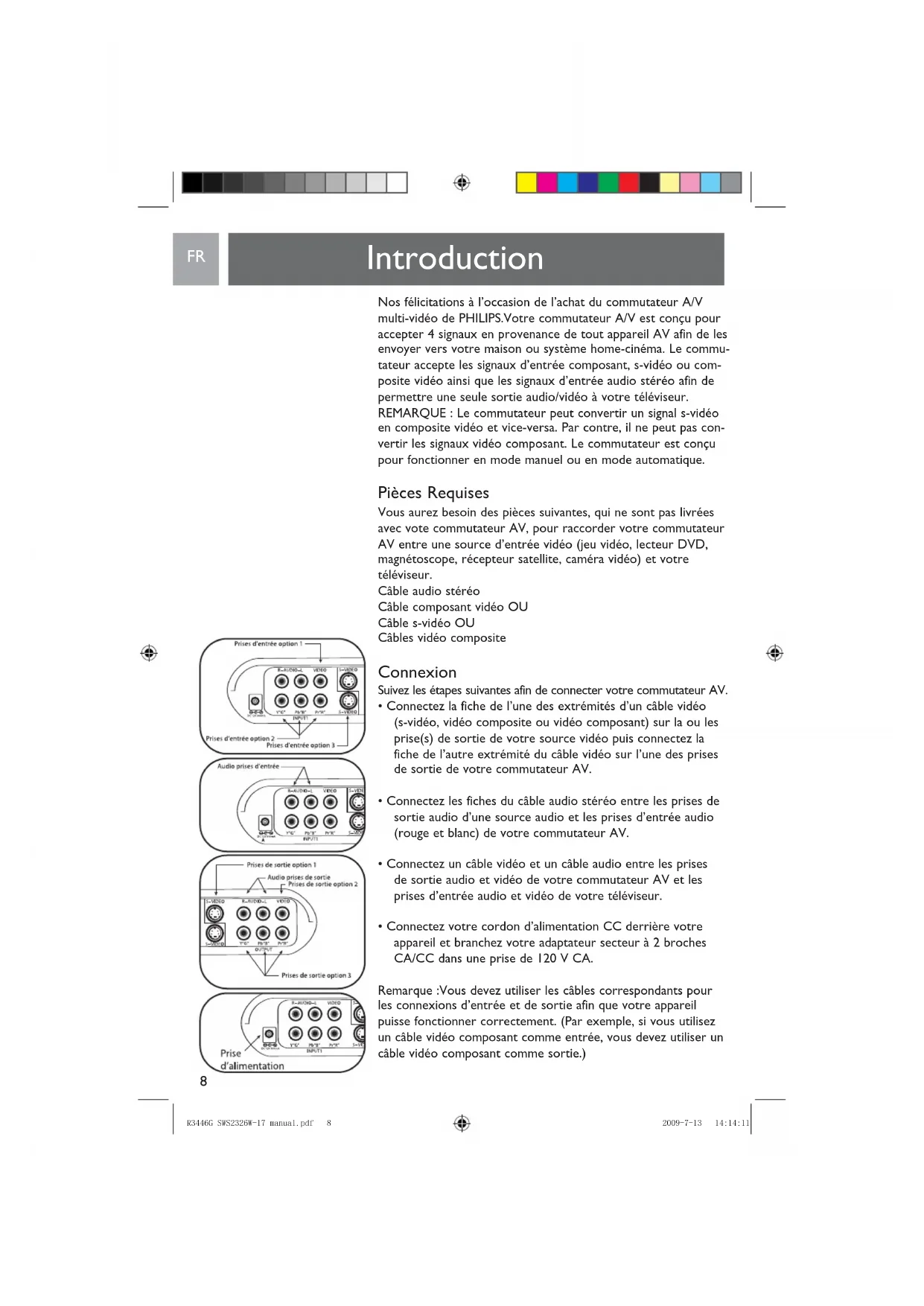 Nos félicitations à l’occasion de l’achat du commutateur A/V multi-vidéo de PHILIPS.Votre commutateur A/V est conçu pour accepter 4 signaux en provenance de tout appareil AV afin de les envoyer vers votre maison ou système home-cinéma. Le commu- tateur accepte les signaux d’entrée composant, s-vidéo ou com- posite vidéo ainsi que les signaux d’entrée audio stéréo afin de permettre une seule sortie audio/vidéo à votre téléviseur. REMARQUE : Le commutateur peut convertir un signal s-vidéo en composite vidéo et vice-versa. Par contre, il ne peut pas con- vertir les signaux vidéo composant. Le commutateur est conçu pour fonctionner en mode manuel ou en mode automatique. Pièces Requises Vous aurez besoin des pièces suivantes, qui ne sont pas livrées avec vote commutateur AV, pour raccorder votre commutateur AV entre une source d’entrée vidéo (jeu vidéo, lecteur DVD, magnétoscope, récepteur satellite, caméra vidéo) et votre téléviseur. Câble audio stéréo Câble composant vidéo OU Câble s-vidéo OU Câbles vidéo composite Connexion Suivez les étapes suivantes afin de connecter votre commutateur AV.