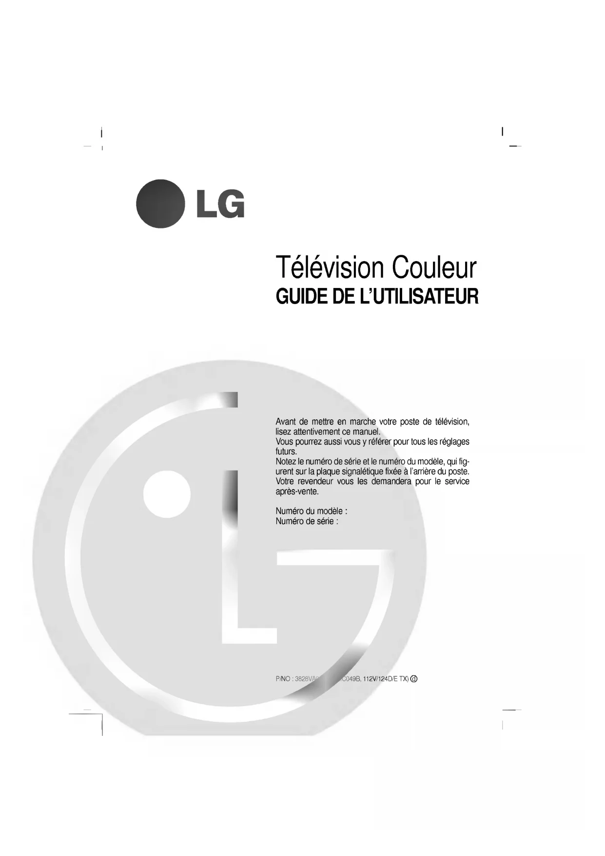 3828VA0474N (MC049B, 112V/124D/E TX) dTable des matieres Installation3 Emplacement etfonctionsdescommandes4LeboitierdetelecommandeInstallationdes piles /Face avantFonctionnementdebase8Misesous/horstensionduteleviseurSelectiondesprogrammes/ Reglage duvolumeRetourauprogramme precedent Coupure dusonSelectiondela langue pour l'affichage ecran (en option) Menusecran9Selectiondesmenus Memorisation deschaines10 Programmation automatique Programmation manuelle/Editiondesprogrammes Programme favori/Tabledesprogrammes Reglage l'image 16PSM (memorisation des parametres l'image) Reglage l'image Eye (en option) Selectionde l'image turbo (en option) Reglage duson (en option) 18SSM (memorisation des parametres son) Reglage dusonEmetteurFM (modulation frequences) (en option) Selectiondusonturbo (en option) Selectiondelasortieaudio (en option) Reception Stereo/Bilingue (en option) Reception NICAM (en option) Arrangemente temps Reglage l'horloge Reglage delamiseenmarche/arret automatique Miseenveille automatique Autresfonctions22ModesTVetAV/CommutationAV automatique (en option) Verrouillage desecuritepourlesenfants/Fondbleu (en option) Inclinaison (en option) Demagnetisant (en option) Jeux (en option) /Miseenveille Image dans l'image (en option) 25Activation desactivation/Selectiondumoded'incrustationVasculemententre image principale image incrustee Programme deselectionpour l'image incrusteeTaillede l'image incrustee/Gelde l'image incrustee Changment position l'image incrustee4ou9sous images Teletexte (en option) 26Pouractiver/desactiverleteletexte/TexteSIMPLETexteTOP (en option) /FASTEXT/Fonctionsteletexte speciales Branchementsexternes29Viala prise del'antennePrisesentree/sortieAudio/Video (en option) Viala prise Peritel (en option) Prises d'entreeS-Video/Audio (S-AV) (en option) Prises d'entreeCOMPOSANT (en option) Prisepourcasque (en option) Depannage 2Installation Mise sous tension Verifiezquevotre voltage correspond voltage indique surla plaque signaletique fixeeal'arrieredu poste. Branchezvotre appareil unique- mentsurcourantalternatif.S'ilyadeseclairs d'orage oudescoupuresde courant, debrancherlafiched'antenneetla prise secteur. Avertissement Poureviter les risques d'incendieou d'electrocution, n'exposez pasceteleviseurala pluie oual'humidite. Entretien N'otez jamais capot arrieredevotreteleviseur.Vous pourriez etre expose aun voltage treseleveouad'autres dangers. l'appareil nefonctionnepas,debranchez-leetcontactezvotrerevendeur.Silecabled'alimentationest endommage, ildoitetre remplace parle fabricant, sonservice apres venteouunepersonnede qualification similaireafind'eviterun danger. Antenne Uneantennedoitetreraccordeeala prise marquee
