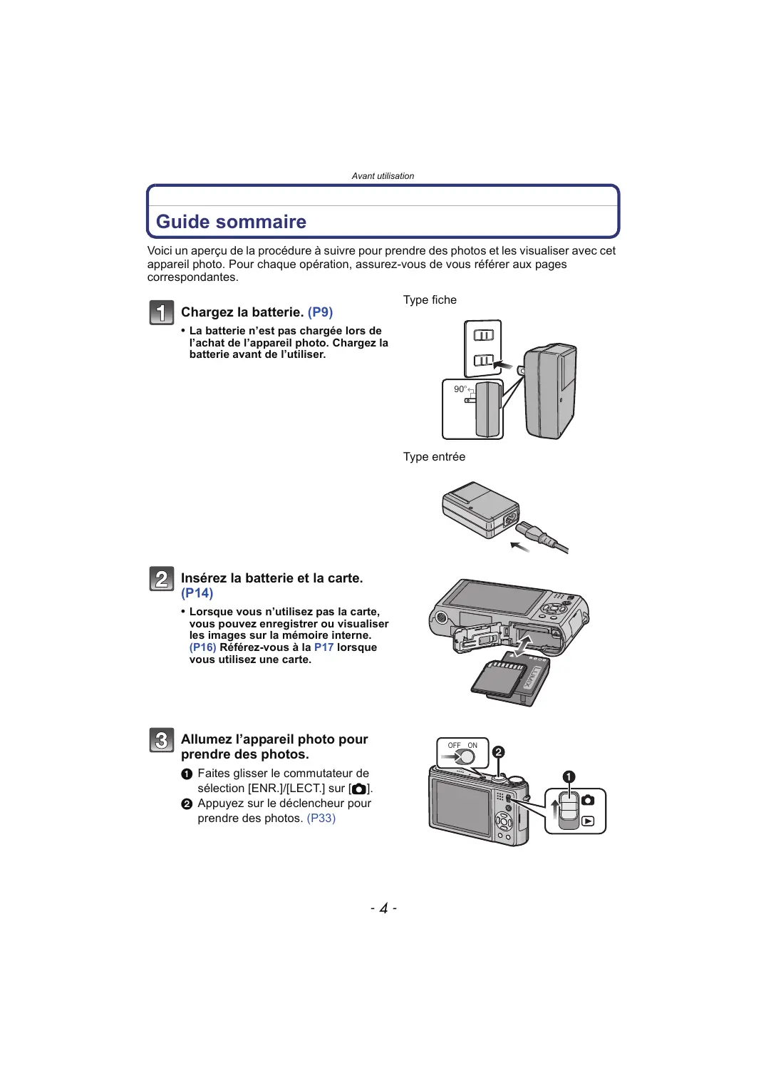 Avant utilisation Avant utilisation Guide sommaire Voici un aperçu de la procédure à suivre pour prendre des photos et les visualiser avec cet appareil photo. Pour chaque opération, assurez-vous de vous référer aux pages correspondantes. Type fiche Chargez la batterie. (P9)