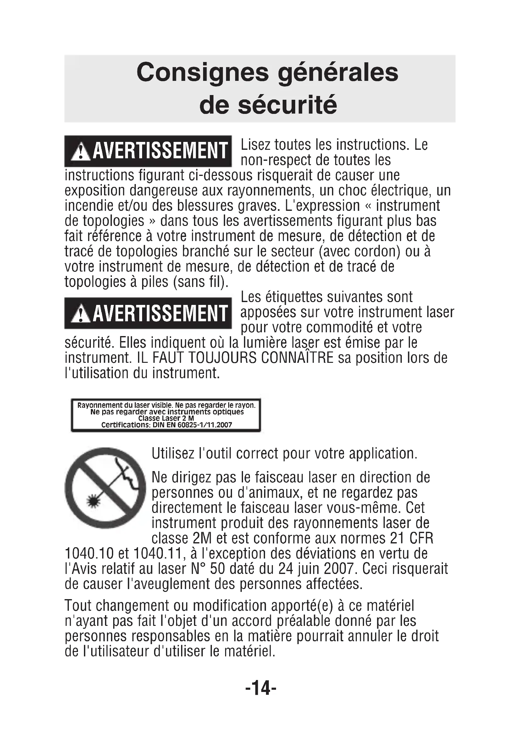 AVERTISSEMENT Rayonnement du laser visible. Ne pas regarder le rayon. Ne pas regarder avec instruments optiques Classe Laser 2 M Certifications: DIN EN 60825-1/11.2007MISE EN GARDE L'utilisation des commandes, la réalisation de réglages ou l'exécution de procédures autres que ce qui est indiqué aux présentes risquerait de causer une exposition dangereuse aux rayonnements. NE RETIREZ PAS et n'effacez pas des étiquettes d'avertissement ou de mise en garde. Le retrait de telles étiquettes augmente le risque d'exposition aux rayonnements laser. L'emploi de commandes ou de réglages autres que ceux qui sont indiqués dans ce mode d'emploi risquerait de causer une exposition dangereuse aux rayonnements. ASSUREZ-VOUS TOUJOURS que les personnes présentes aux environs de l'endroit où vous employez cet instrument sont au courant des dangers résultant de l'observation directe du faisceau laser. NE PLACEZ PAS l'instrument dans une position telle que cela permettrait à quiconque de regarder directement le faisceau laser intentionnellement ou non. Ceci risquerait de causer des blessures graves aux yeux. POSITIONNEZ TOUJOURS l'instrument de façon qu'il soit stable. La chute de l'instrument risquerait d'endommager ce dernier et/ou de causer des blessures graves à son utilisateur. N'UTILISEZ TOUJOURS que les accessoires qui sont recommandés par le fabricant de votre instrument. L'emploi d'accessoires qui ont été conçus pour emploi avec d'autres outils risquerait de causer des blessures graves. N'UTILISEZ PAS cet instrument dans un but autre que ceux qui sont indiqués dans ce mode d'emploi. Ceci risquerait de causer des blessures graves. NE LAISSEZ PAS l'instrument allumé (« ON ») sans surveillance dans un mode de fonctionnement quelconque. NE DÉMONTEZ PAS l'instrument. Il ne contient aucune pièce pouvant être réparée par l'utilisateur. Ne modifiez ce produit en aucune façon. Toute modification de cet instrument risquerait de causer une exposition dangereuse aux rayonnements. N'UTILISEZ PAS les verres de visionnement du laser à la place de lunettes de protection. Les verres de visionnement du laser -15-sont utilisés pour améliorer la visualisation du faisceau laser, mais ils ne protègent pas contre les rayonnements laser. N'UTILISEZ PAS pas les verres de visionnement du laser en guise de lunette de soleil ou lorsque vous conduisez un véhicule. Ces verres n'assurent pas une protection complète contre les rayons UV et ils réduisent la perception des couleurs. N'UTILISEZ PAS d'instruments optiques tels, que, entre autres, des télescopes ou des lunettes d'astronome pour regarder le faisceau laser. Ceci risquerait de causer des blessures graves aux yeux. NE FIXEZ PAS directement des yeux le faisceau laser et ne projetez pas la faisceau laser directement dans les yeux d'autres personnes. Ceci risquerait de causer des blessures graves aux yeux. CONSERVEZ CES INSTRUCTIONS. Sécurité sur le lieu de travail Maintenez votre lieu de travail propre et bien éclairé. Les lieux de travail encombrés ou sombres invitent les accidents. N'UTILISEZ PAS l'instrument laser à proximité d'enfants, et ne laissez pas des enfants se servir de l'instrument laser. Cela risquerait de produire des blessures graves aux yeux. Sécurité électrique Les piles risquent d'exploser ou de fuir, et de causer des blessures ou un incendie. Afin de réduire ce risque, suivez toujours toutes les instructions et tous les avertissements figurant sur l'étiquette des piles et sur l'emballage. NE COURT-CIRCUITEZ PAS de bornes des piles. NE RECHARGEZ PAS des piles alcalines. NE MÉLANGEZ PAS des piles neuves et des piles usagées. Remplacez toutes les piles en même temps par des piles neuves de la même marque et du même type. NE MÉLANGEZ PAS des piles ayant des compositions chimiques différentes.