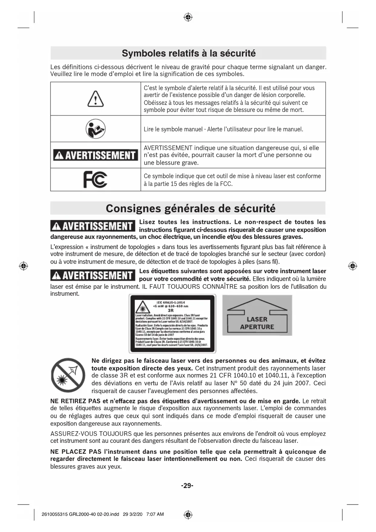 interférences, y compris celles qui sont susceptibles d’entraîner un fonctionnement indésirable de l’appareil. Industrie Canada (IC) 2610055315 GRL2000-40 02-20.indd 32 3/2/20 7:07 AM-33- La numérotation des éléments de l’appareil se réfère à la représentation du laser rotatif et du chargeur sur les pages 2, 3, et 5. 1 Interrupteur Marche/Arrêt laser rotatif 2 Bouton pour le fonctionnement en mode incliné à deux axes 3 Vitesse de rotation (GRL2000-40HV seulement) 4 Bouton de direction inférieur / anti-horaire 5 LED d’indication de mise à niveau de l’axe X / Y 6 Faisceau laser en rotation 7 Orifice de sortie du faisceau d’aplomb (GRL2000-40HV seulement) 8 Faisceau d’aplomb (GRL2000-40HV seulement) 9 Cellule de réception pour télécommande 10 l’indicateur bas de pile 11 Voyant d’alerte fonction anti-chocs 12 Bouton de direction supérieur / horaire 13 Fonctionnement de la ligne et sélection de la longueur (GRL2000-40HV seulement) 14 Compartiment de la batterie 15 Verrou du compartiment à piles 16 Raccord de trépied 5/8-11 17 Numéro de série 18 Plaque d’avertissement du laser 19 Étiquette d’avertissement, rayonnement laser ouverture de sortie 20 Télécommande* 21 Trépied* 22 Tige de mise à niveau* 23 LR20 Récepteur laser 24 Lunettes de vision du faisceau laser* 25 Support mural / unité d’alignement* 26 Vis de fixation murale* 27 Vis de verrouillage pour montage mural* 28 Support d’instrument 5/8-11* 29 Plaque de mesure de plafond* 30 Cas* 31 Support récepteur *Les accessoires décrits ou montrés ne sont pas compris dans l’emballage standard. Features 2610055315 GRL2000-40 02-20.indd 33 3/2/20 7:07 AM-34- Données techniques Rotational Laser Level GRL2000-40H GRL2000-40HV Zone de travail (diamètre) –sans récepteur
